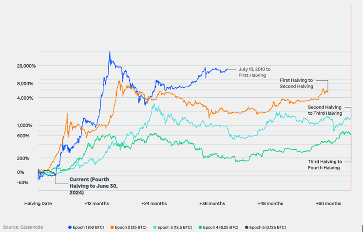 Die Kursleistung von Bitcoin seit dem vierten Halving stärkt ebenfalls die Argumentation für die Lebensfähigkeit des BTC-Bull-Marktes und zeigt, dass noch Spielraum vorhanden ist. Rückblickend hat die Pionier-Krypto unmittelbar nach jedem Halving-Zyklus horizontal geschwankt, bevor sie innerhalb des Jahres deutlich anstieg.