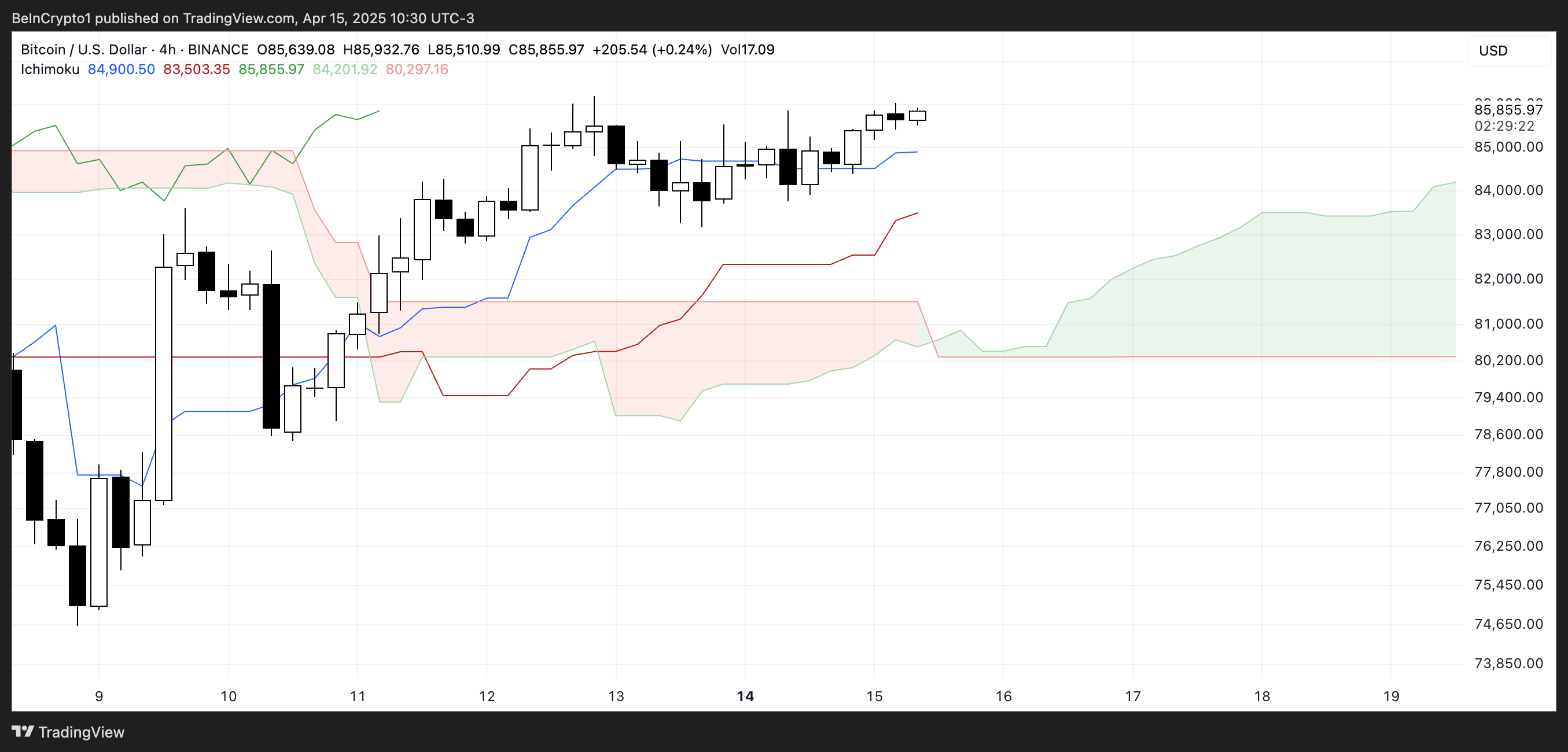 Die Ichimoku-Charts von Bitcoin bleiben bullish, da der Preis fest über dem Tenkan-sen (blaue Linie) und dem Kijun-sen (rote Linie) notiert.