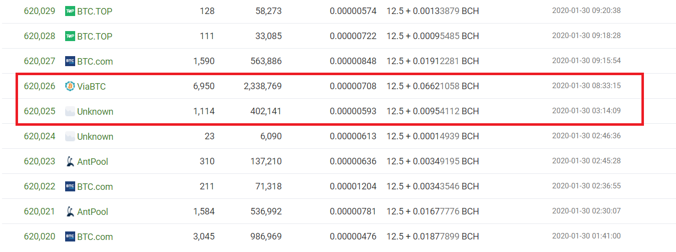 Zwischen der Erzeugung der Blöcke 620.025 und 620.026 lagen über fünf Stunden. Quelle: btc.com