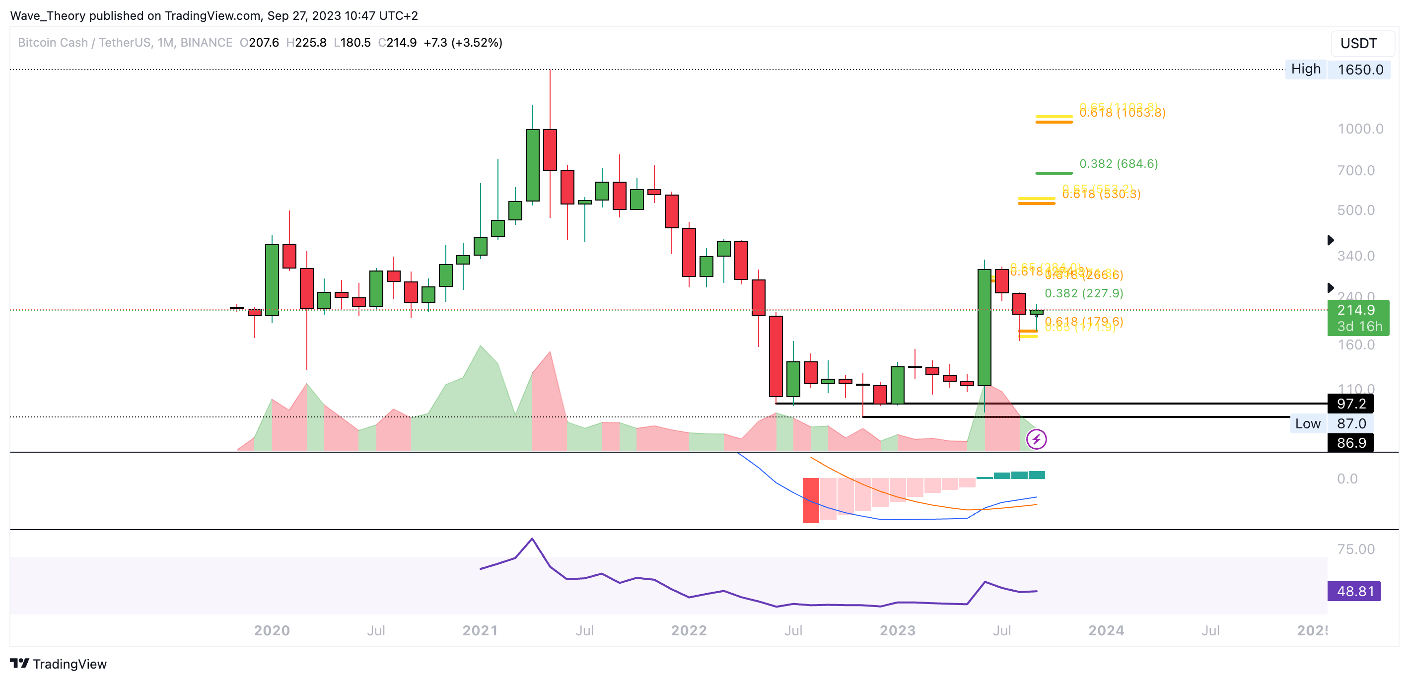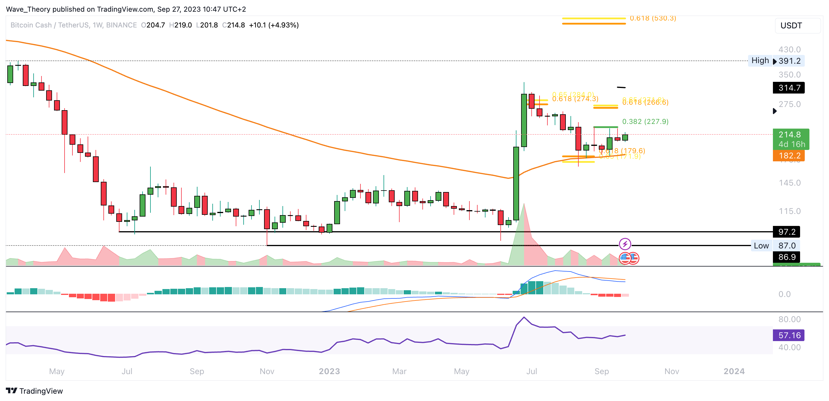Im Monatschart ist ein deutlicher Aufwärtstrend im Histogramm des MACDs zu erkennen. Zudem sind die MACD Linien bullisch überkreuzt, während sich der RSI neutral zeigt. Insgesamt ist die Aufwärtsbewegung, welche vor drei Monaten begonnen hat, solange bullisch intakt, wie sich der Bitcoin Cash Kurs über der Golden Ratio Unterstützung bei rund 178 USD hält.