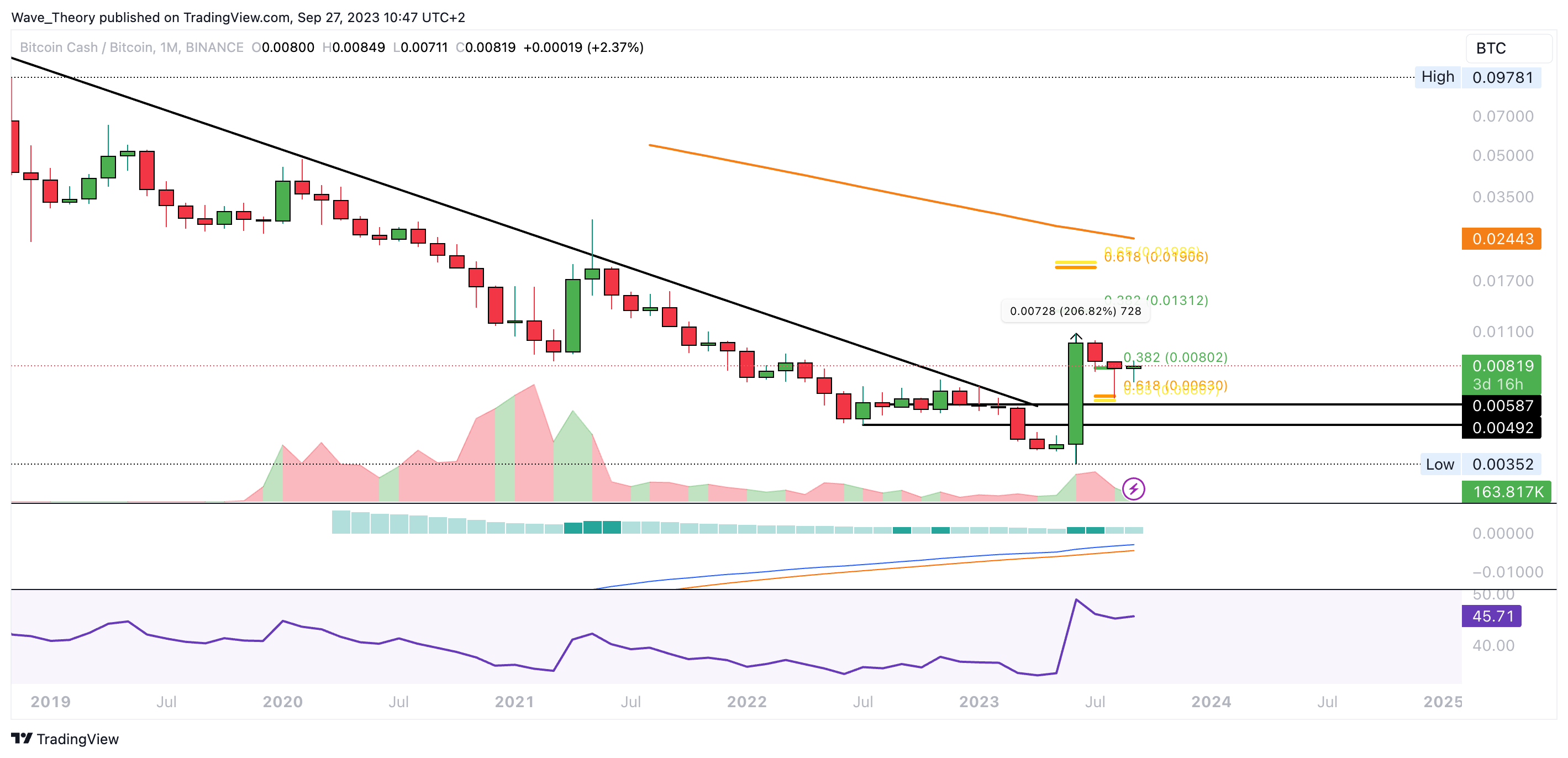 Im Vergleich zu Bitcoin hat der Bitcoin Cash Kurs die Unterstützung der Golden Ratio bei etwa 0,0063 BTC erreicht und konnte von dort aus stark ansteigen. Dadurch trifft der BCH Kurs nun auf einen bedeutenden Widerstand am 0,382 Fib Niveau, der bei etwa 0,008 BTC liegt. Obwohl das Histogramm des MACDs in den letzten Monaten eine bullische Tendenz aufwies, zeigt es aktuell eine bärische Neigung. Die MAC Linien bleiben jedoch bullisch gekreuzt, während der RSI neutral bleibt.