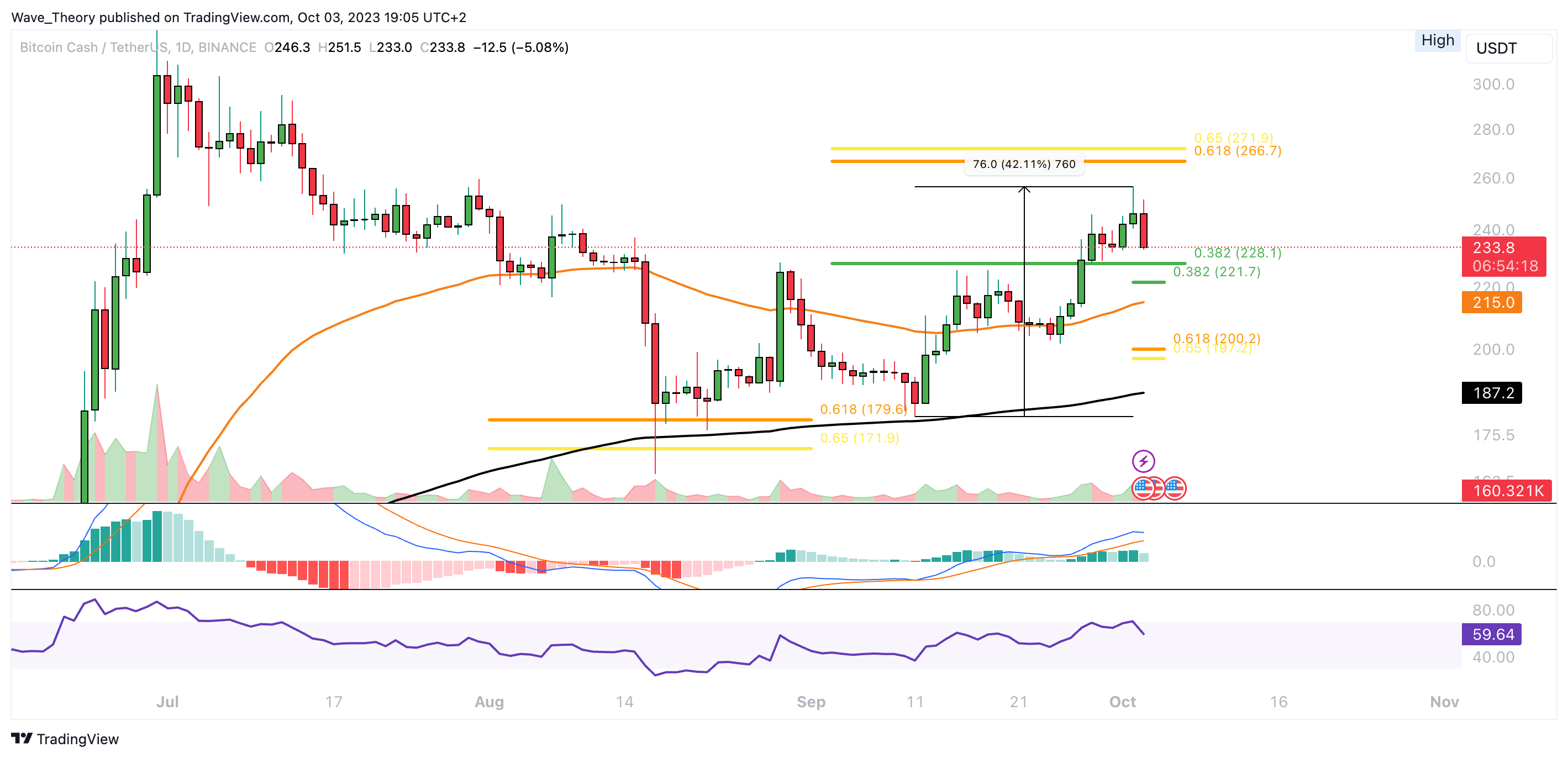 Der Bitcoin Cash Kurs konnte vor einigen Wochen an der Golden Ratio Unterstützung bei rund 175 USD bullisch abprallen, um eine starke Aufwärtsbewegung zu initiieren. Daraufhin konnte der BCH Kurs sowohl den 50-Tage-EMA Widerstand bei rund 215 USD als auch den 0,382 Fib Widerstand bei rund 228 USD überwinden.