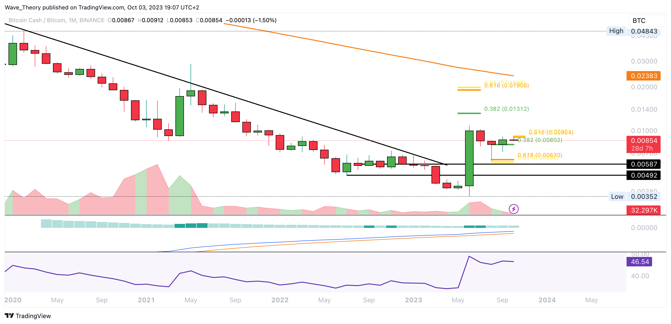 Gegen BTC konnte sich der Bitcoin Cash letzten Monat über der 0,382 Fib Unterstützung bei rund 0,008 BTC halten. In diesem Monat kämpft der BCH Kurs jetzt mit dem Golden Ratio Widerstand bei rund 0,009 BTC. Bricht Bitcoin Cash diesen, könnte er zum letzten Hochpunkt bei rund 0,0108 BTC steigen.