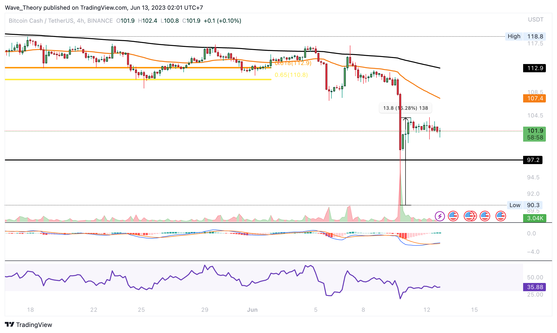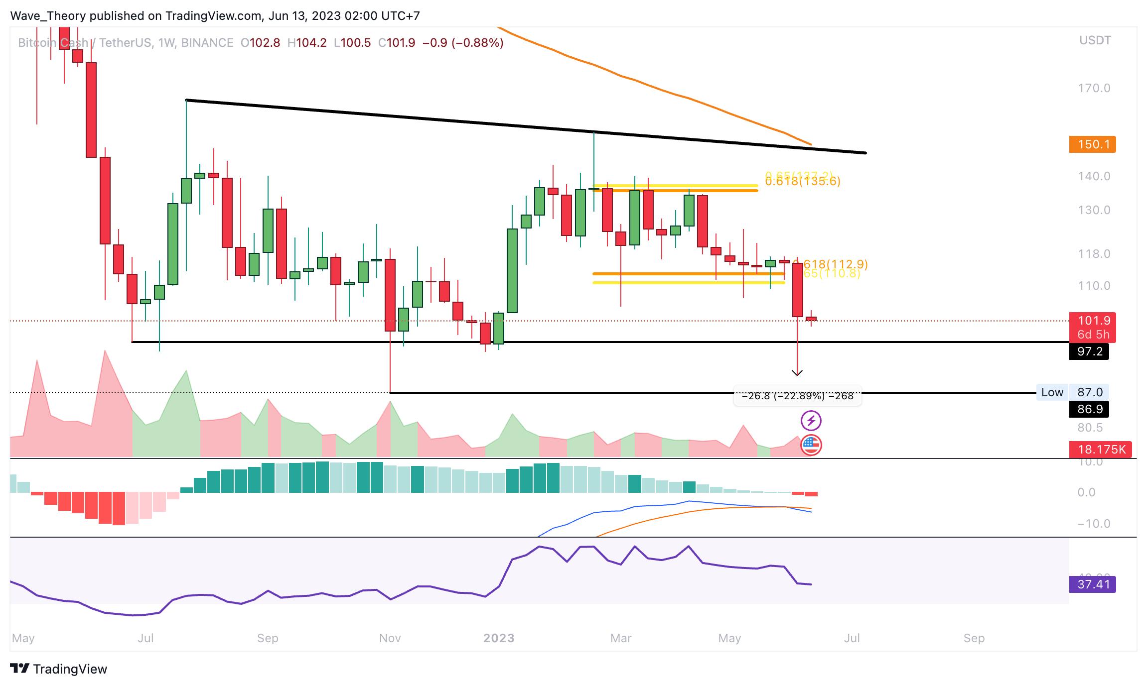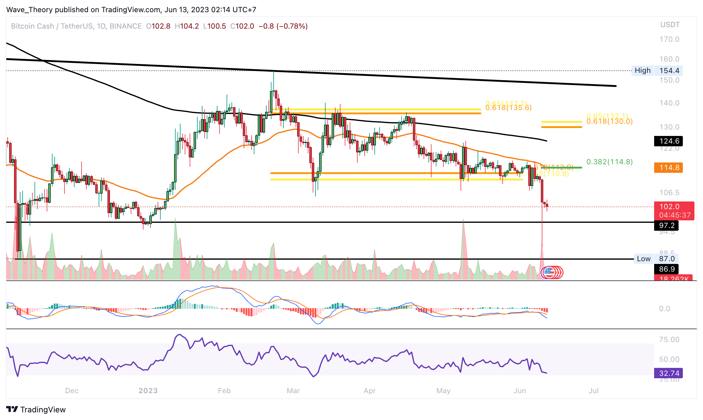 “Noch befindet sich der Bitcoin Cash Kurs über der Golden Ratio Unterstützung bei rund 112 USD. Wenn sie bricht, könnte der BCH Kurs aber eine Etage tiefer fallen. Dann könnte der BCH Kurs unter die 100 US-Dollar Marke fallen. Denn dann wartet erst wieder zwischen rund 87 USD und 97 USD signifikante Unterstützung auf den BCH Kurs.”