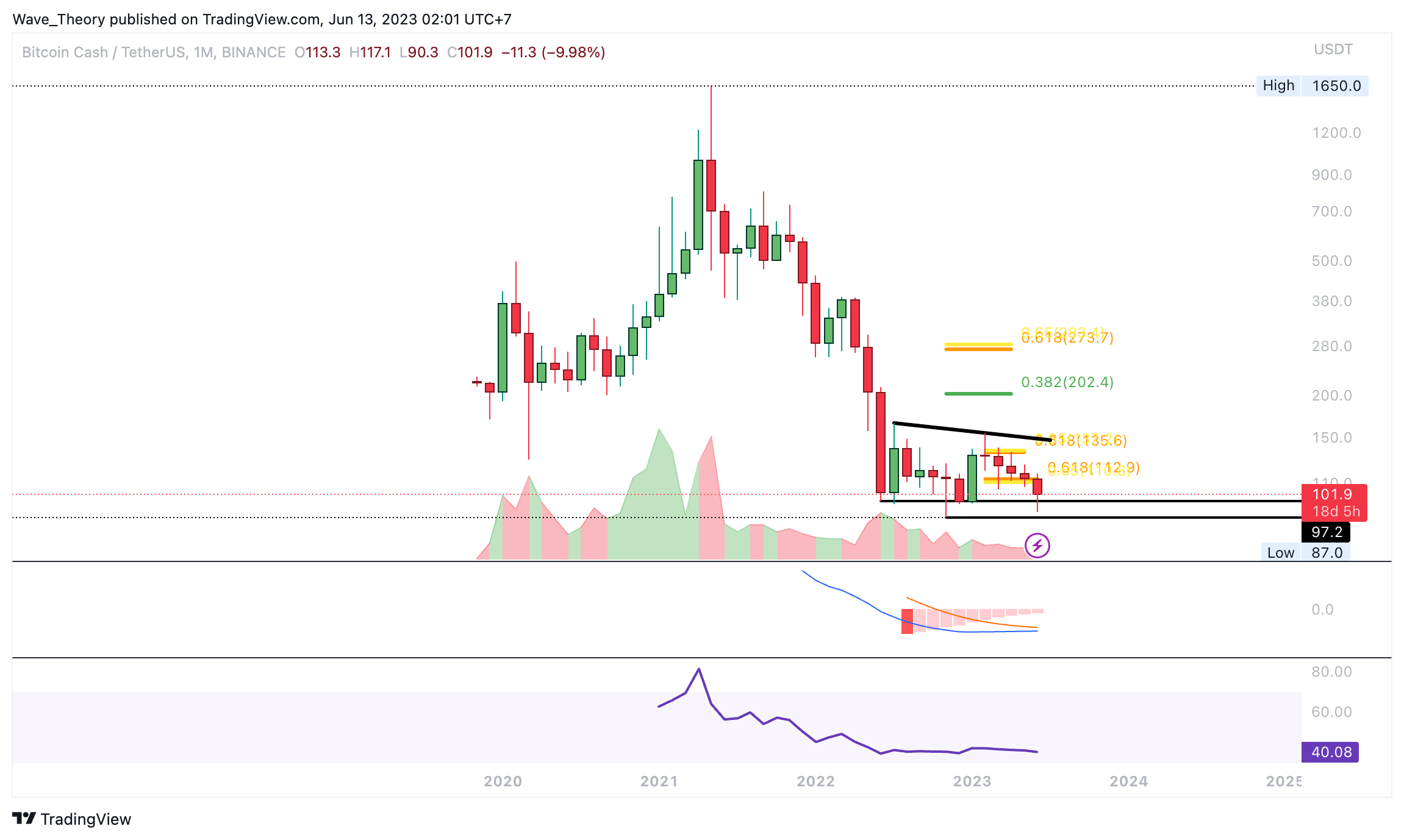 Im Monatschart tickt das Histogramm des MACDs trotzdem immer noch bullisch höher. Auch die MACD Linien könnten sich bald bullisch überkreuzen. Dennoch befindet sich BCH derzeit an der letzten Unterstützung. Wenn diese bricht, ist das Abwärtspotenzial nahe 0 quasi unbegrenzt.