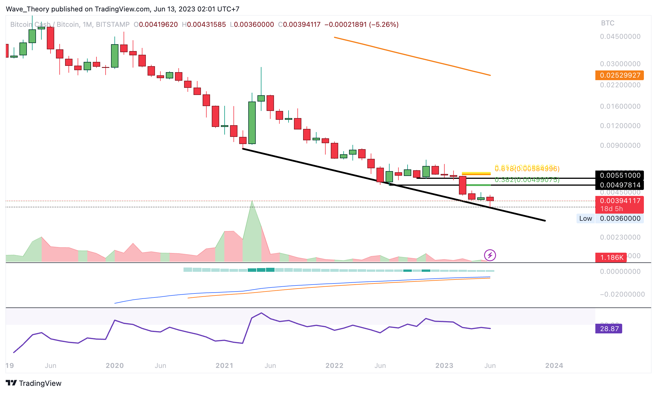 Gegen BTC setzt der Bitcoin Cash Kurs den Abwärtstrend fort. Auch das Histogramm des MACDs tickt seit einigen Monaten bärisch tiefer, womit sich auch die MACD Linien bald bärisch überkreuzten könnten. Der RSI befindet sich dabei in überverkauften Regionen. Nichtsdestoweniger scheint der BCH Kurs aktuell nach oben bullisch abzuprallen, womit sich eine Trendlinienunterstützung etablieren könnte.