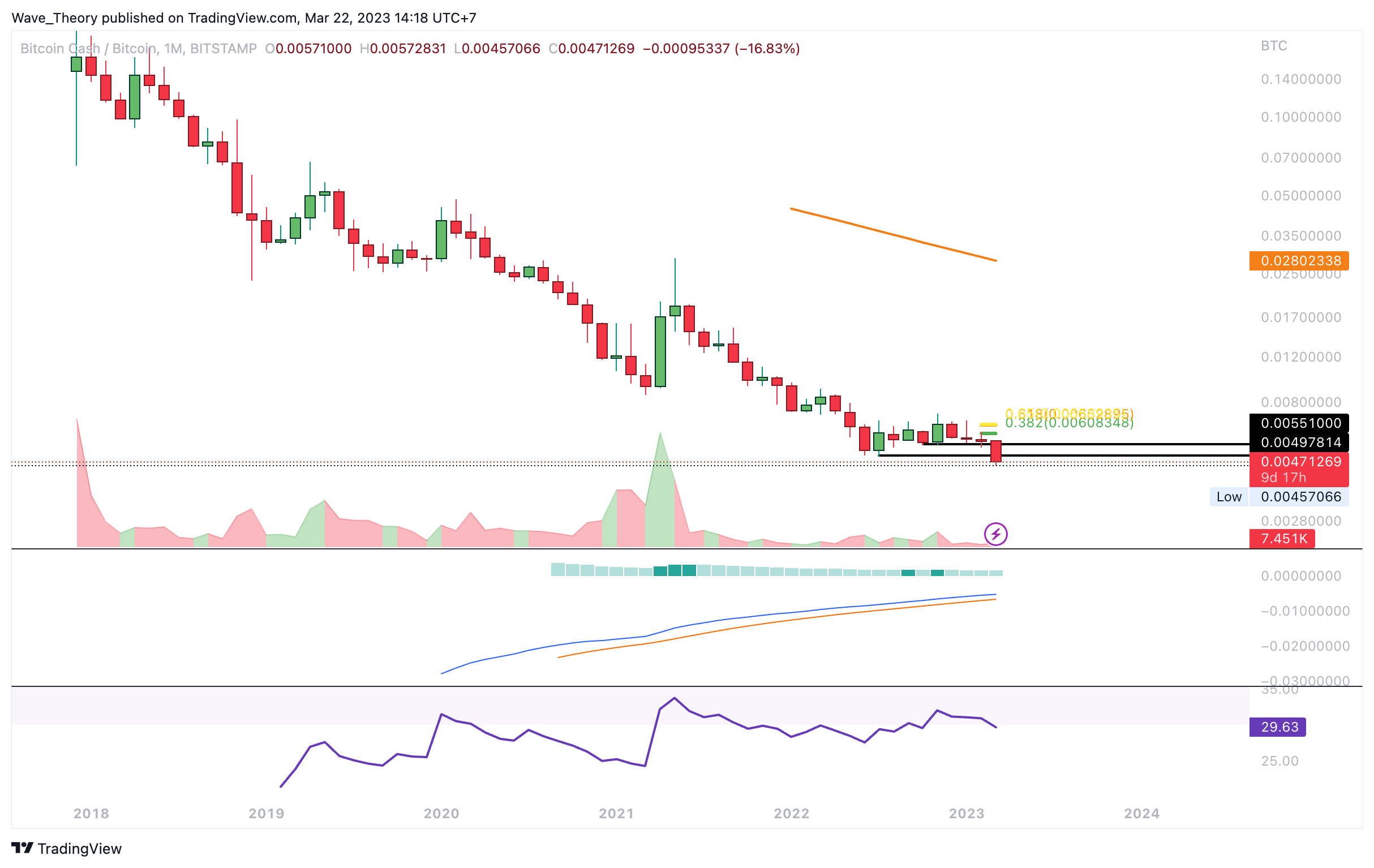 Gegen BTC hat BCH die Unterstützungszone zwischen rund 0,005 BTC und rund 0,0055 BTC bärisch gebrochen. Damit befindet sich BCH jetzt auf einem neuen Allzeittief. Darüber hinaus tickt das Histogramm des MACDs im Monatschart bärisch tiefer. Nach unten hin gibt es keinerlei Unterstützungen mehr.