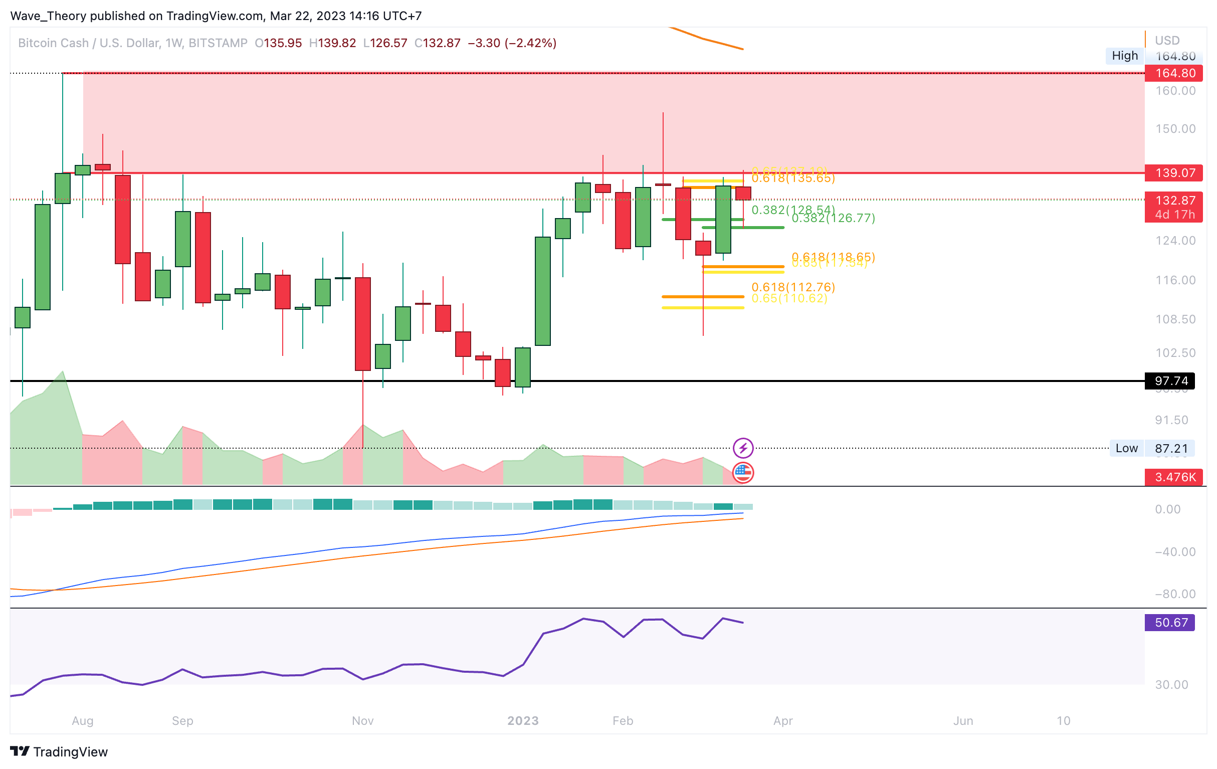 Nachdem der BCH Kurs nach unserer letzten Kurs Prognose zunächst von rund 138,2 USD auf rund 122,36 USD gefallen war, unternahm Bitcoin Cash erneut den Versuch, den Golden Ratio Widerstand bei rund 134 USD zu brechen. Doch beim zweiten Versuch scheiterte Bitcoin Cash daran und stieß stattdessen auf bärische Ablehnung.