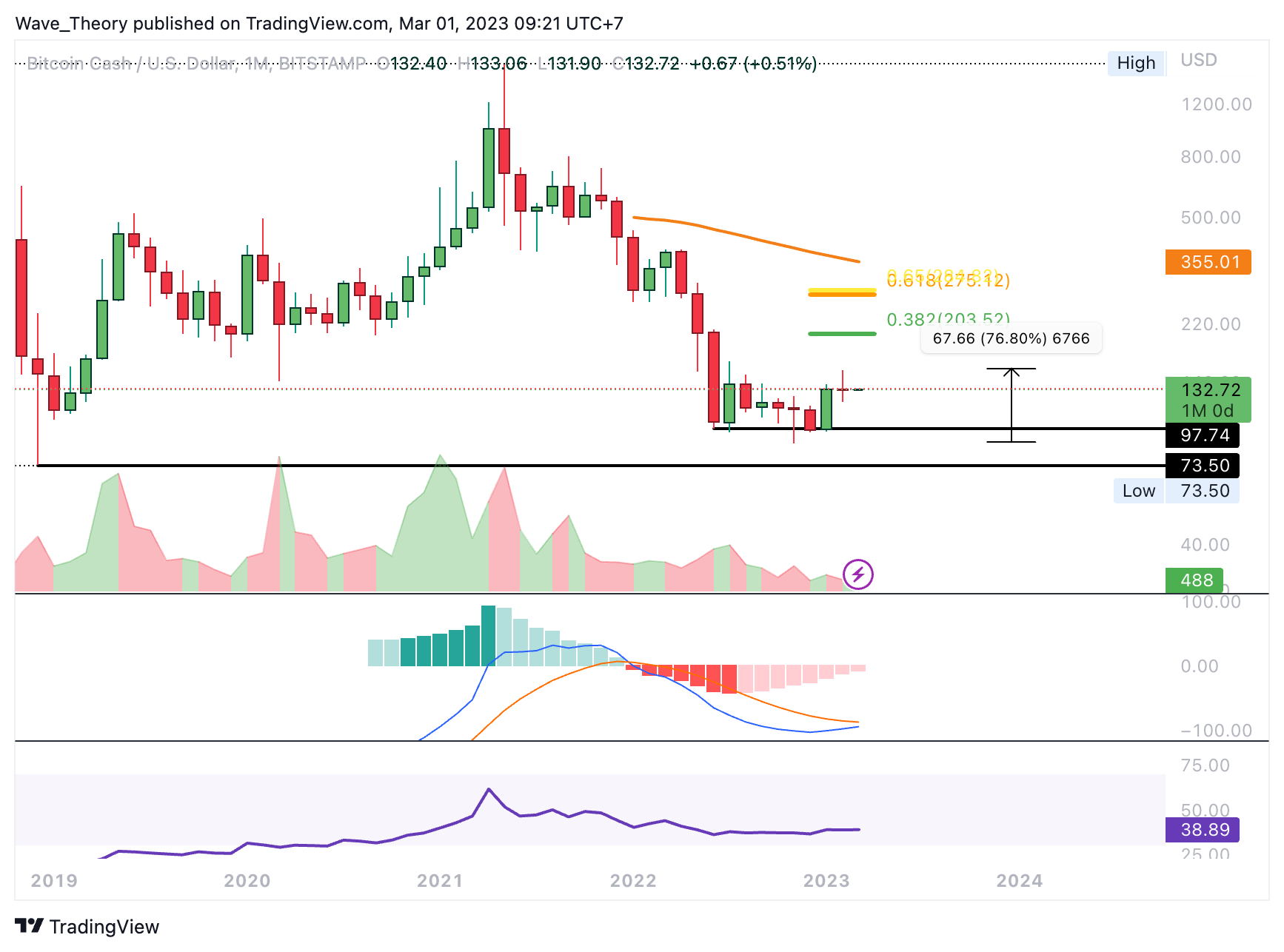 Der BCH Kurs konnte an der Unterstützung zwischen rund 73,5 USD und rund 97,75 USD bullisch abprallen und sich dabei rund 77 % erholen. Darüber hinaus tickt das Histogramm des MACDs seit einigen Monaten bullisch höher und auch die MACD Linien könnten sich im Monatschart bald bullisch überkreuzen.