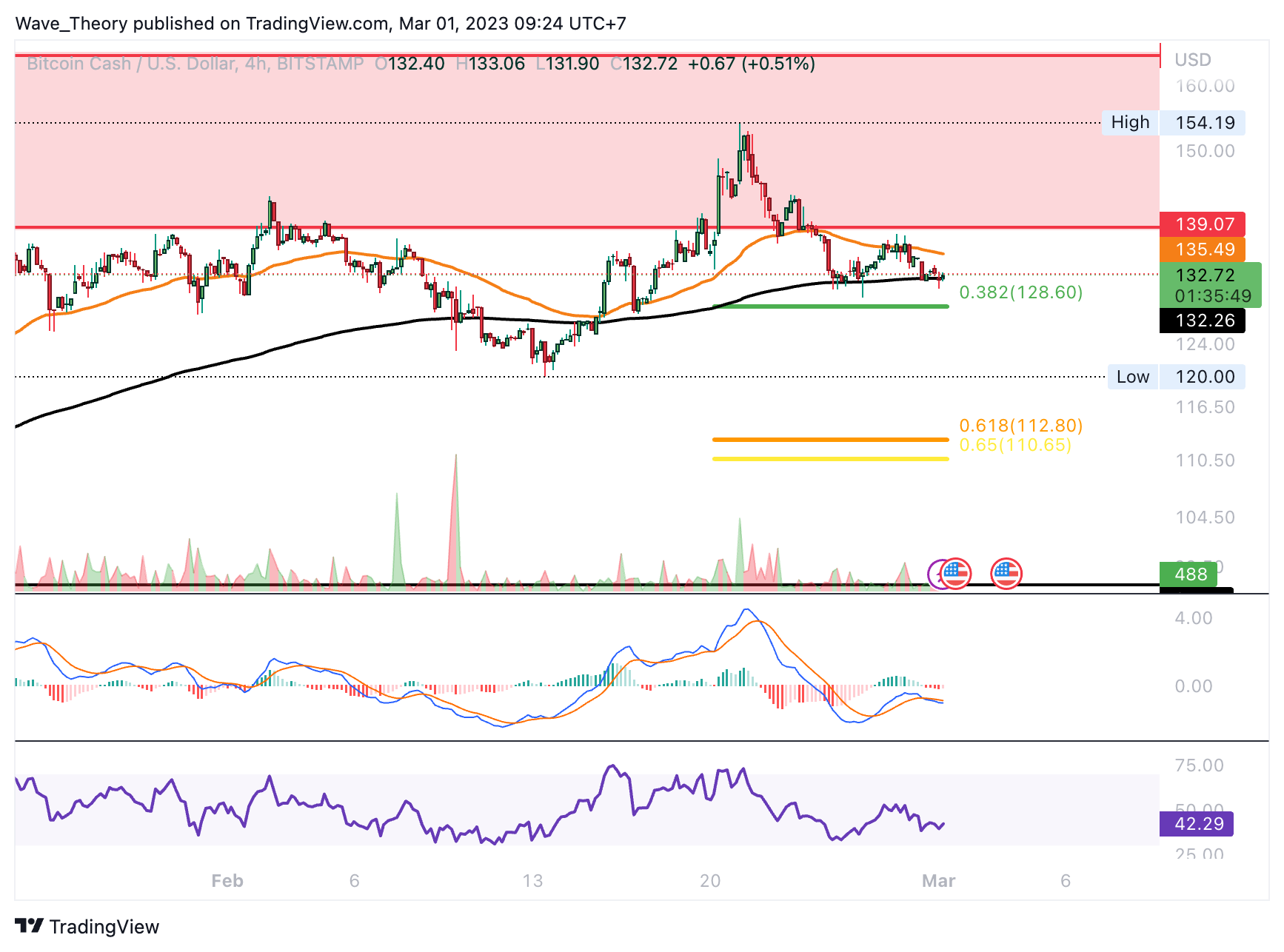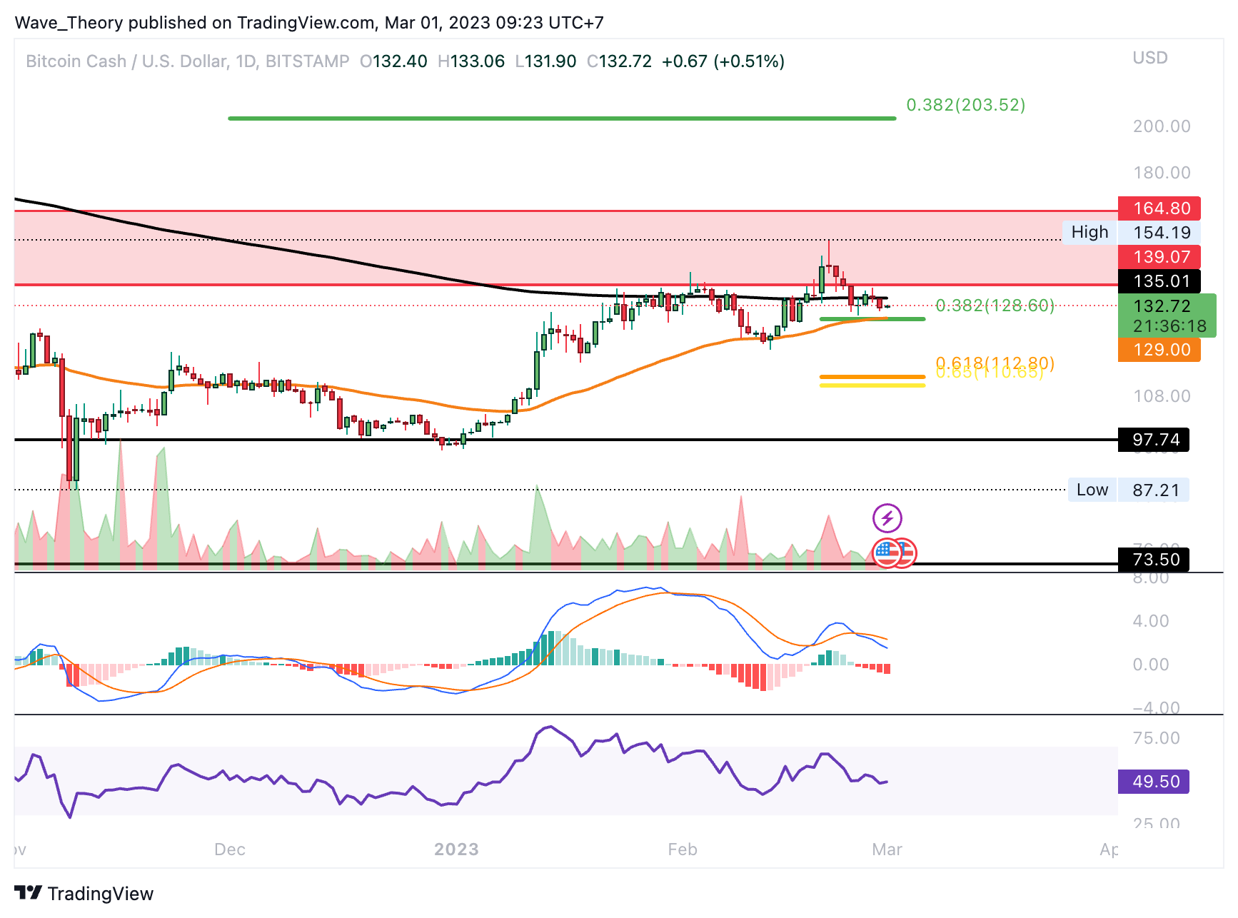 Mit der bärischen Abweisung am Widerstandsbereich zwischen rund 139 USD und rund 164,8 USD ist Bitcoin Cash nicht mehr weit entfernt von den nächsten signifikanten Fibonacci Unterstützungen bei rund 128,6 USD und bei rund 112,5 USD. An der 0,382 Fib Unterstützung bei rund 128,6 USD dient der 50-Tage-EMA als zusätzliche Unterstützung.