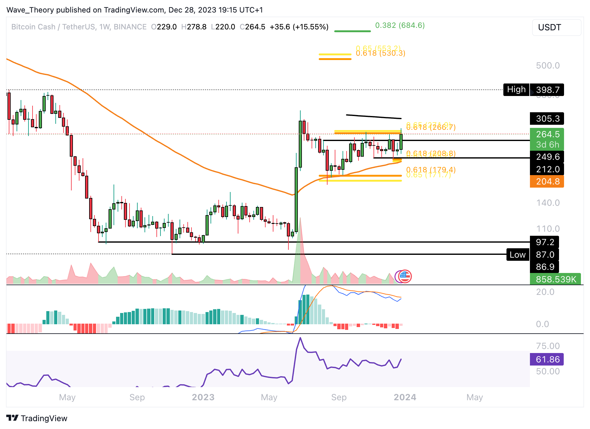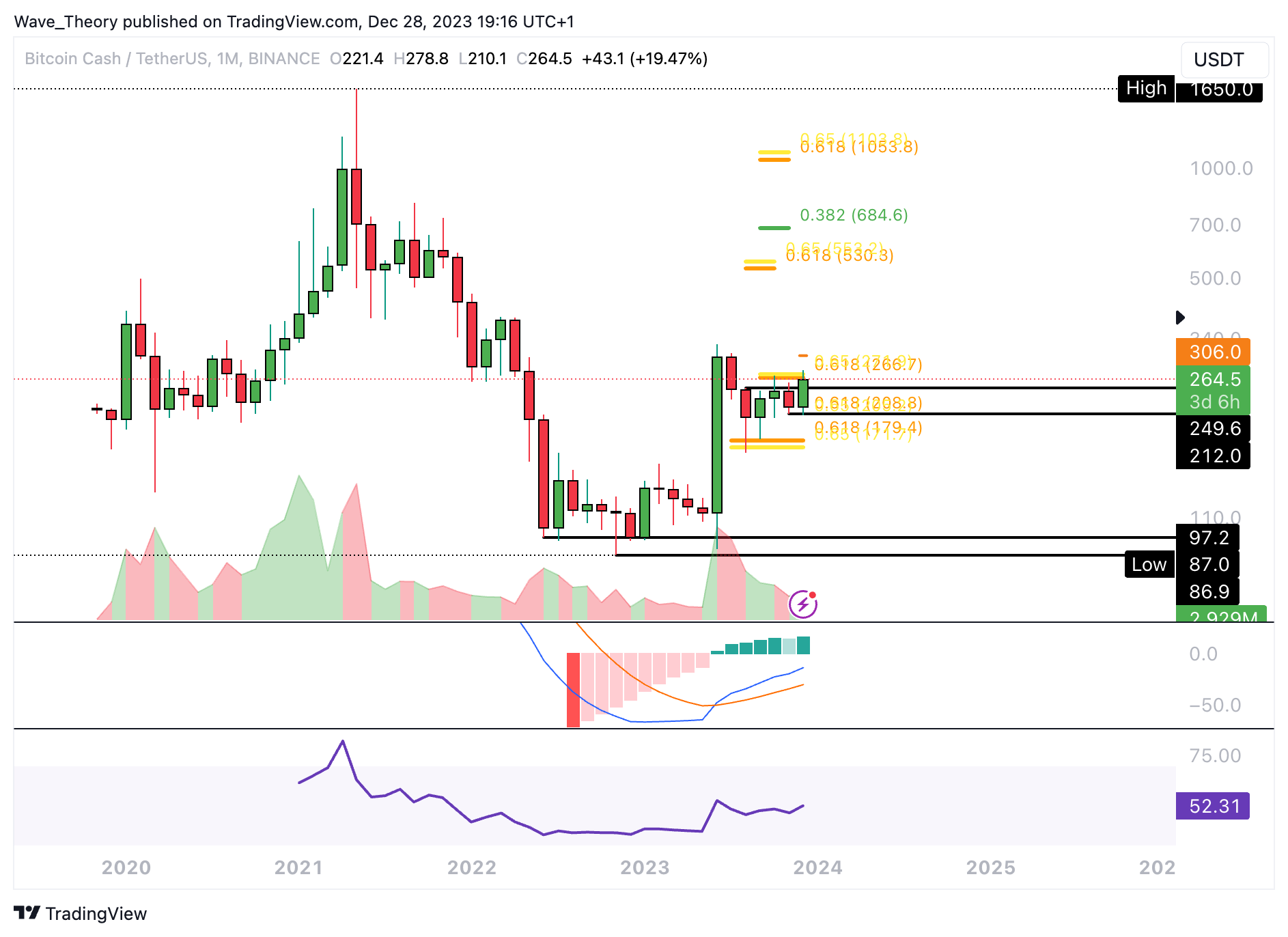 Wenn Bitcoin Cash den Golden Ratio Widerstand bei rund 270 USD nun endlich bricht, wartet bei rund 305 USD der nächste signifikante Widerstand am 200-Wochen-EMA. Anschließend könnte Bitcoin Cash den Golden Ratio Widerstand bei rund 550 USD anvisieren.