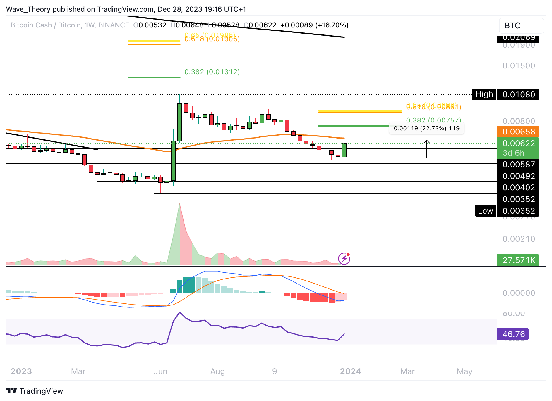 Gegen BTC konnte BCH an der Unterstützung zwischen rund 0,00497 BTC und 0,0059 BTC abprallen und in Zuge dessen rund 23 % steigen. Damit wartet jetzt am 50-Wochen-EMA bei rund 0,0066 BTC signifikanter Widerstand auf den BCH Kurs.