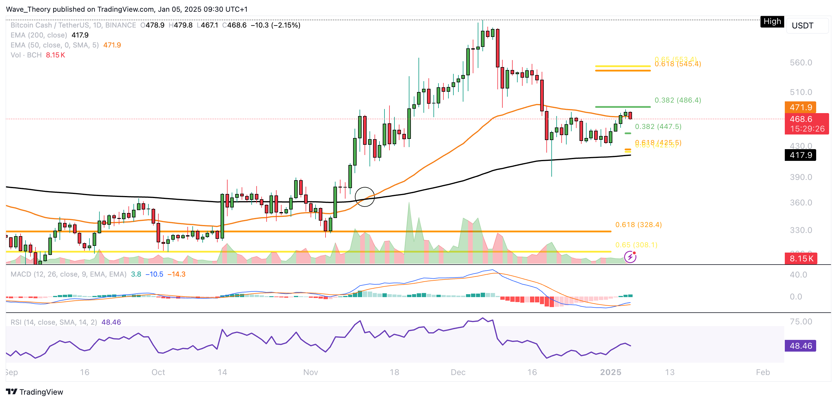 Währenddessen bewegt sich der RSI in neutralem Territorium, ohne bullische oder bärische Signale zu liefern. Zudem konnte BCH vorletzte Woche am 50-Wochen-EMA bei rund 391 USD bullisch abprallen.