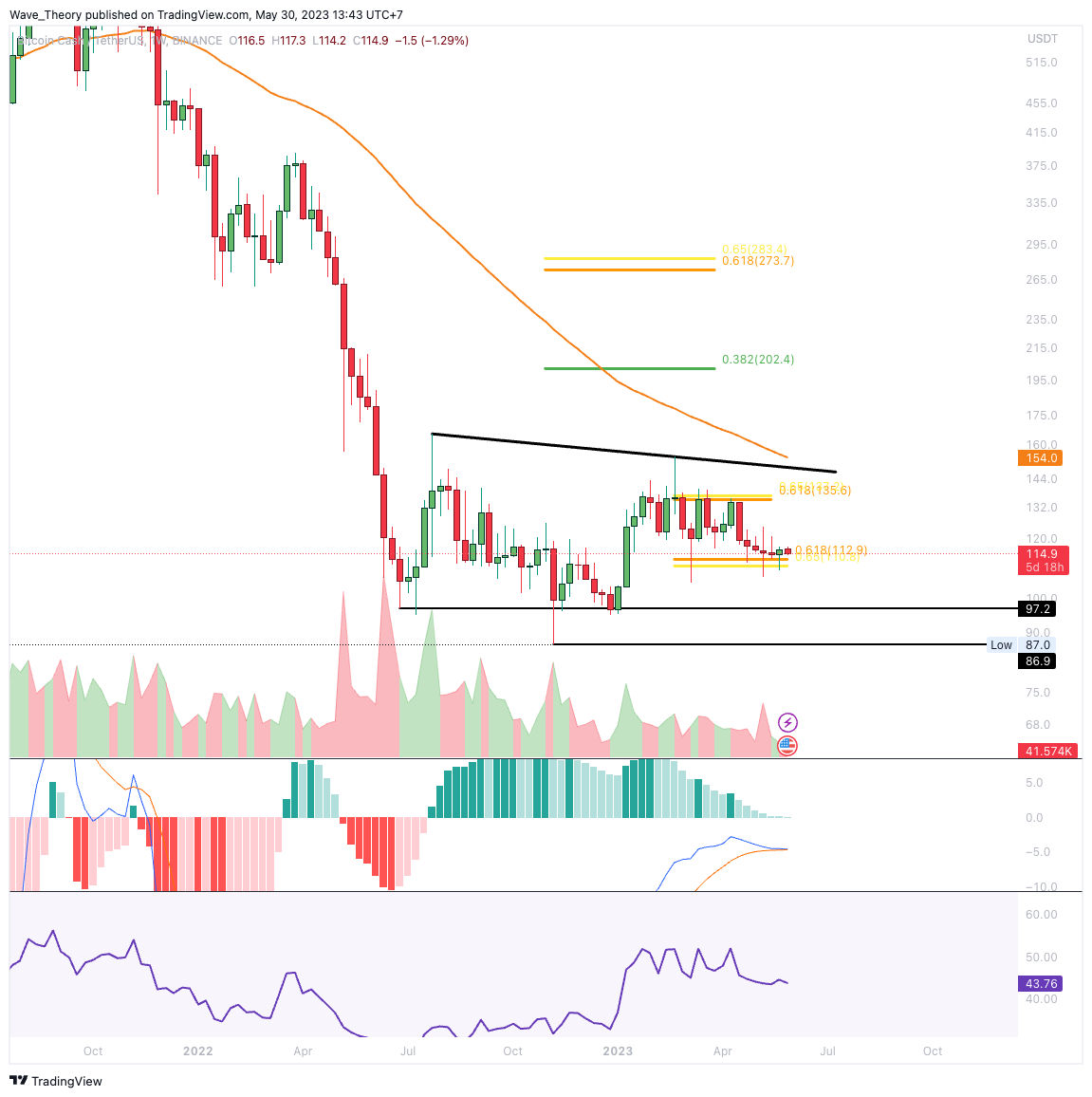 Doch auch an der Golden Ratio Unterstützung bei rund 112 USD kann sich der BCH Kurs schon seit einigen Wochen halten. Hinsichtlich der eher bärischen Indikatoren, rückt ein bärischer Ausbruch immer näher. Dann könnte der BCH Kurs zwischen rund 87 USD und 97 USD korrigieren.