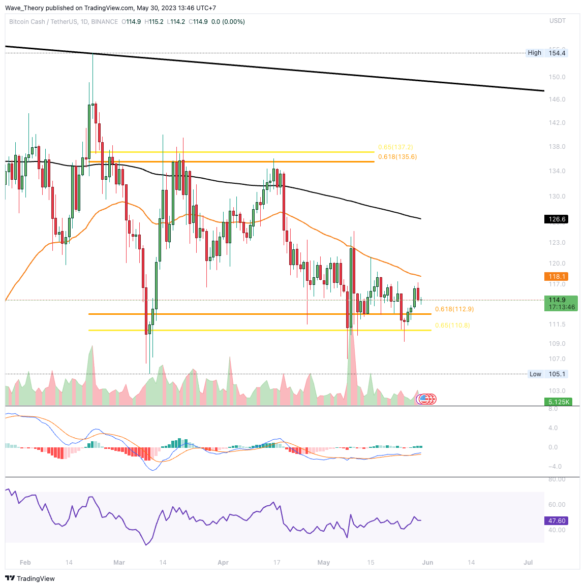 Der Bitcoin Cash Kurs befindet sich seit vier Wochen an der Golden Ratio Unterstützung. Wenn diese jetzt bärisch bricht, könnte der Kurs eine Etage tiefer fallen.