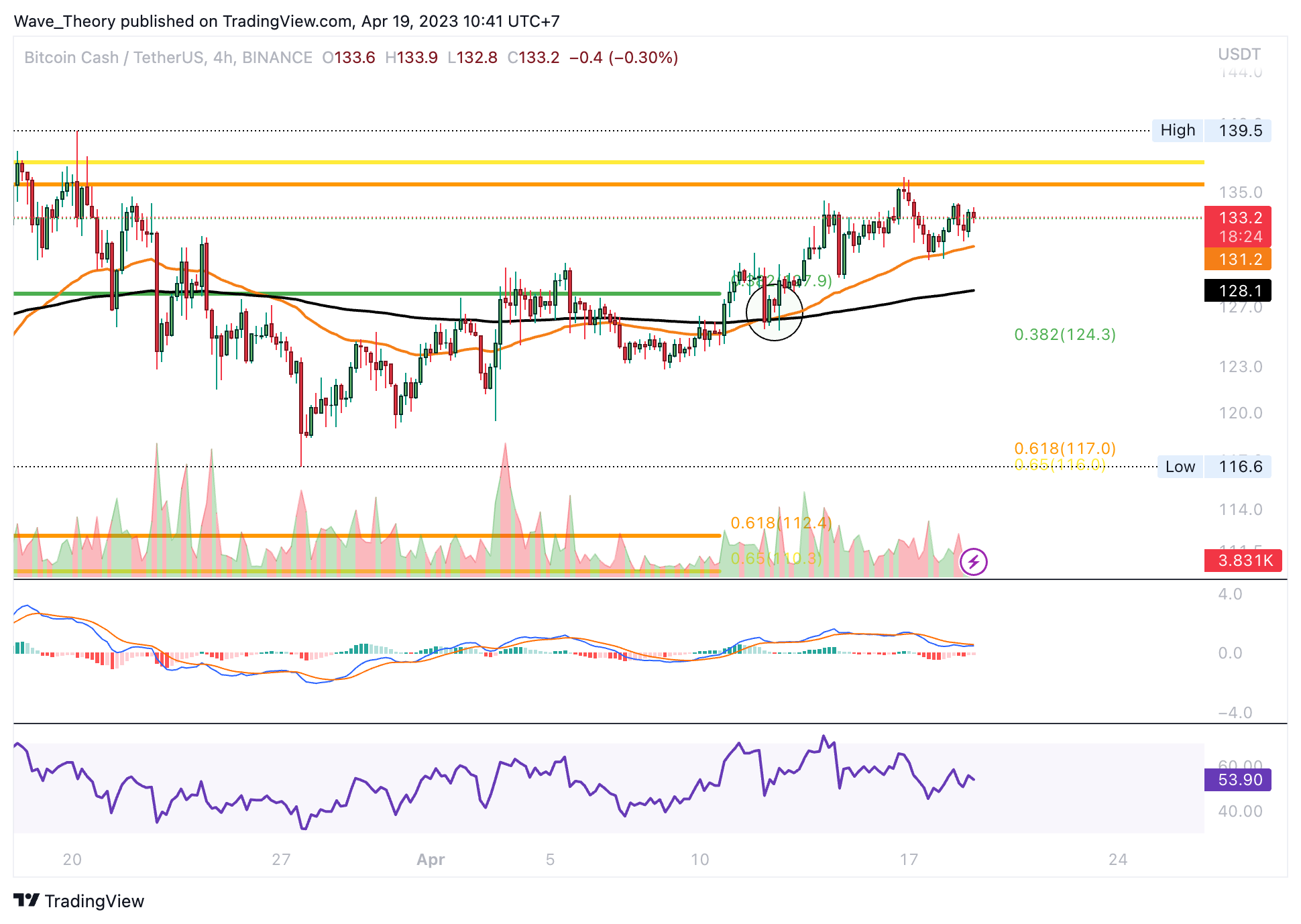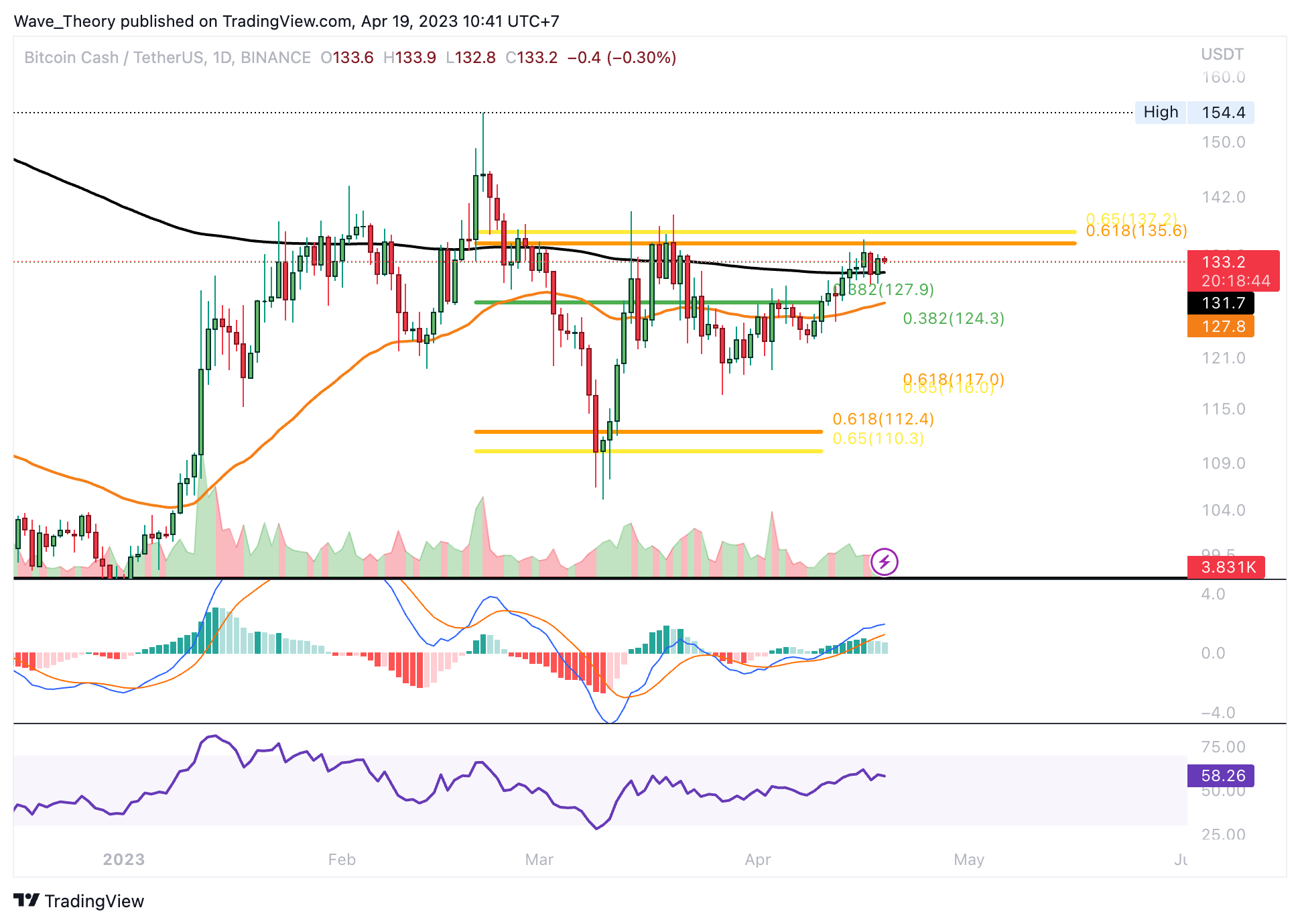 Jetzt befindet sich BCH erneut an diesem Golden Ratio Widerstand. Doch auch dieses Mal scheint Bitcoin Cash daran bärisch abgewiesen zu werden. Jedoch konnte der 200-Tage-EMA bei rund 131,7 USD erfolgreich als Unterstützung dienen, woraufhin BCH jetzt erneut den Versuch unternehmen könnte, den Golden Ratio Widerstand bei rund 135 USD zu brechen.