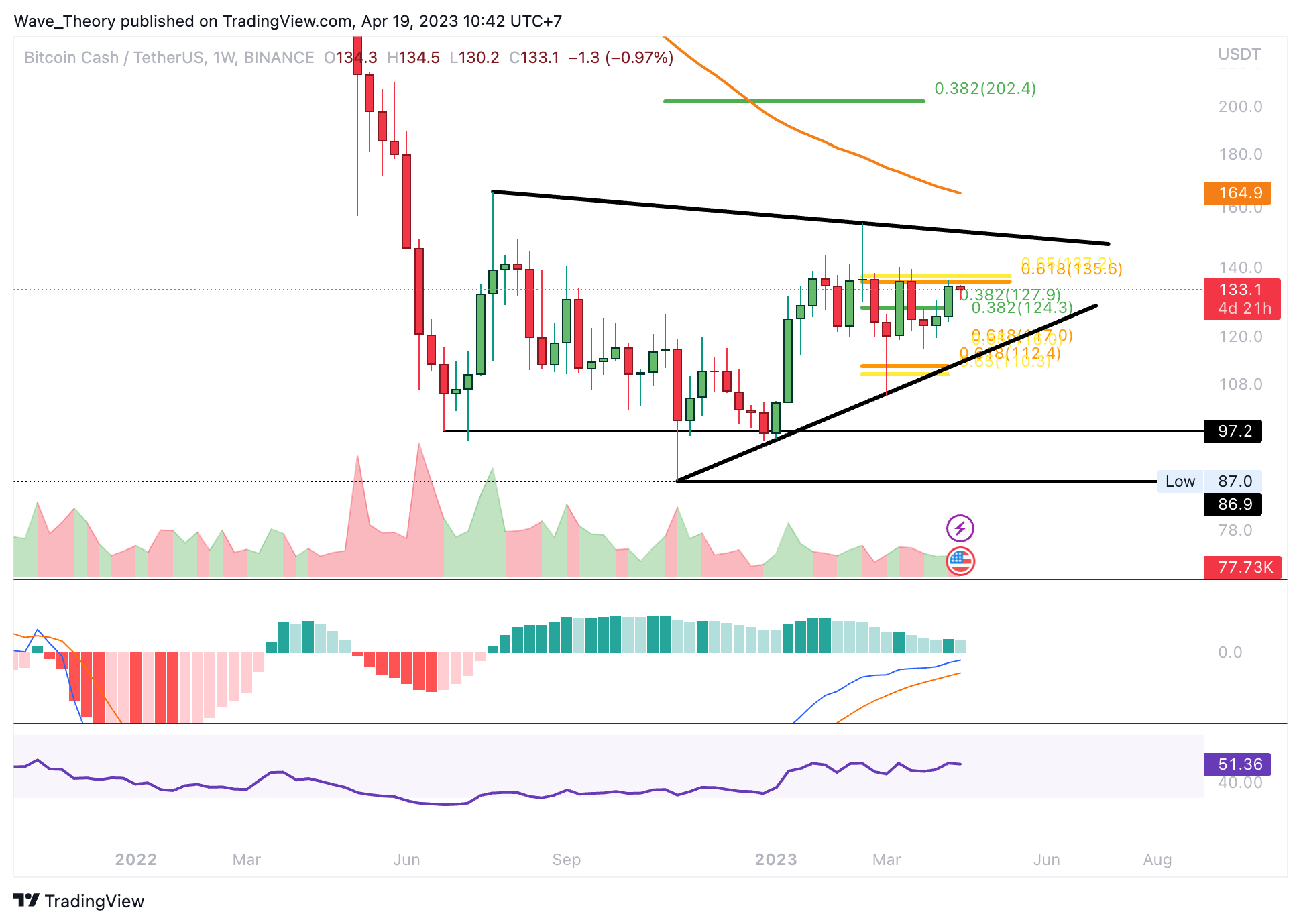 - Es gibt signifikanten Widerstand am 50-Wochen-EMA bei rund 166 USD, bevor Bitcoin Cash zu den Fib Niveaus bei rund 202,4 USD respektive 275 USD steigen kann.