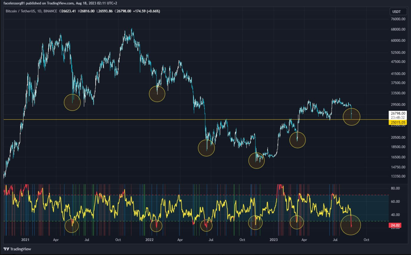 Sponsored SponsoredDazu lieferte er folgendes Bild, welches zeigt, dass der tägliche RSI bei 24,02 liegt – BTC also überverkauft ist.