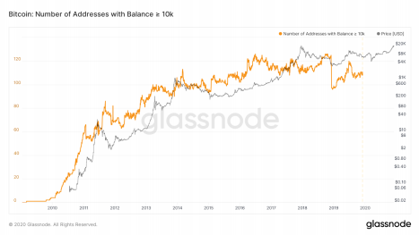 Laut Glassnode gibt es ungefähr 100 Adressen mit mehr als 10.000 BTC (ungefähr 400 Millionen US-Dollar zum Zeitpunkt der Veröffentlichung des Artikels). Dies beinhaltet eine Adresse mit 1,9 Milliarden US-Dollar an BTC, die seit 2014 nicht mehr berührt wurde.
