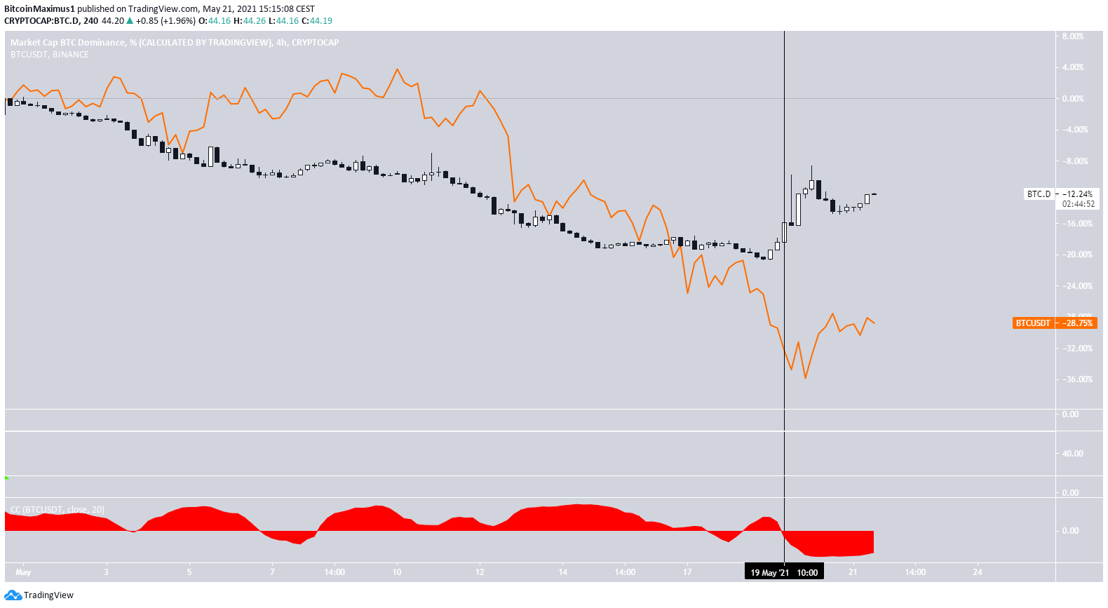 Seit Anfang Mai war die Korrelation zwischen dem Bitcoin Kurs (Orange) und der Bitcoin Dominanz fast ausschließlich positiv. Das siehst du an dem Korrelationskoeffizienten (Rot). Das bedeutet, dass ein Anstieg des einen Wertes einen Abstieg des anderen verursacht. Seit dem Drop vom 19. Mai 2021 ist die Korrelation wieder negativ. Das bedeutet, dass ein Anstieg des Bitcoinpreises zu einem Abstieg der BTCD führt.