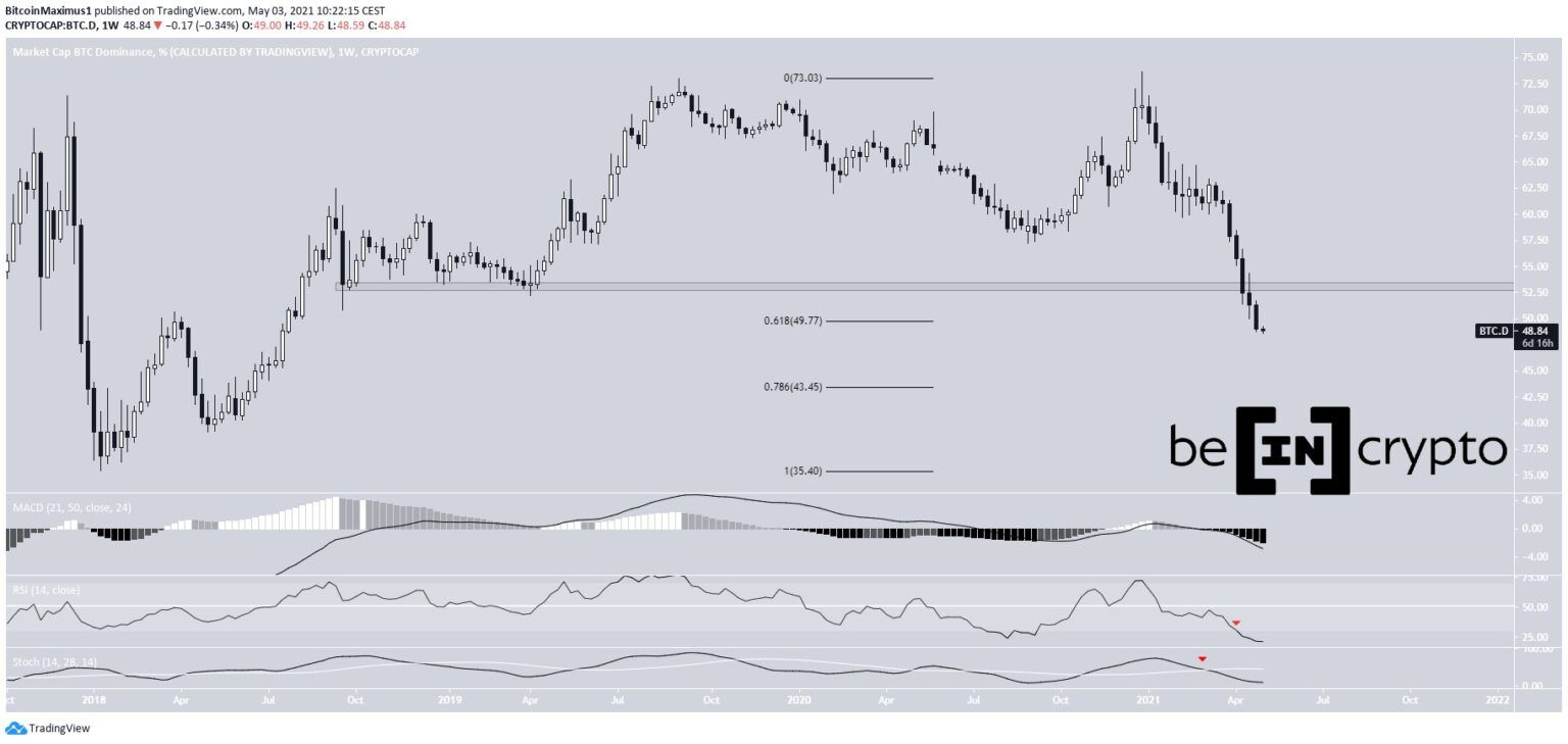 Unsere Analyse des Bitcoin-Dominanz-Wochencharts passt zu dieser Behauptung. Der MACD befindet sich im negativen Bereich und fällt. Der RSI fällt ebenfalls und der Wert ist momentan kleiner als 30. Außerdem gab es vor kurzem ein „bearish Cross“ auf dem „Stochastic Oscillator“. Die Bitcoin Dominance ist interessanterweise vor kurzem unter 53% gefallen. Das ehemalige Support-Level war davor seit Oktober 2019 intakt. Danach ist die BTCD unter das 0.618-Fib-Retracement-Level gefallen, das bei 49,7% liegt. Die nächsten beiden wichtigen Support-Level bei 43,5% (das 0.786-Fib-Retracement-Level) und 35,5% (der Tiefpunkt von 2018).