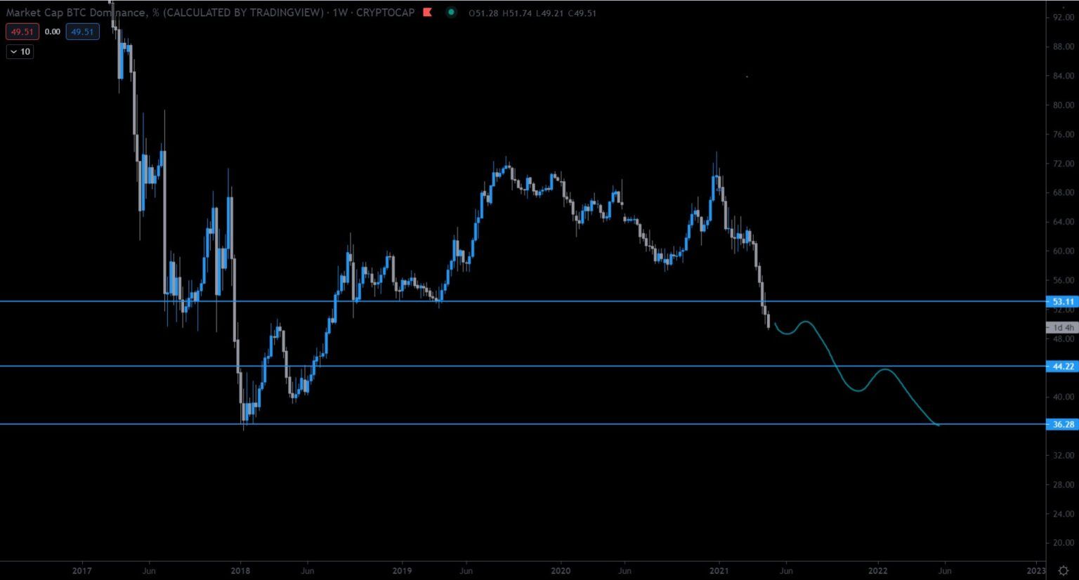 Die Bitcoin Dominanz fällt wahrscheinlich zumindest auf das Support-Level bei 43,5% und möglicherweise sogar auf 35,4%.
