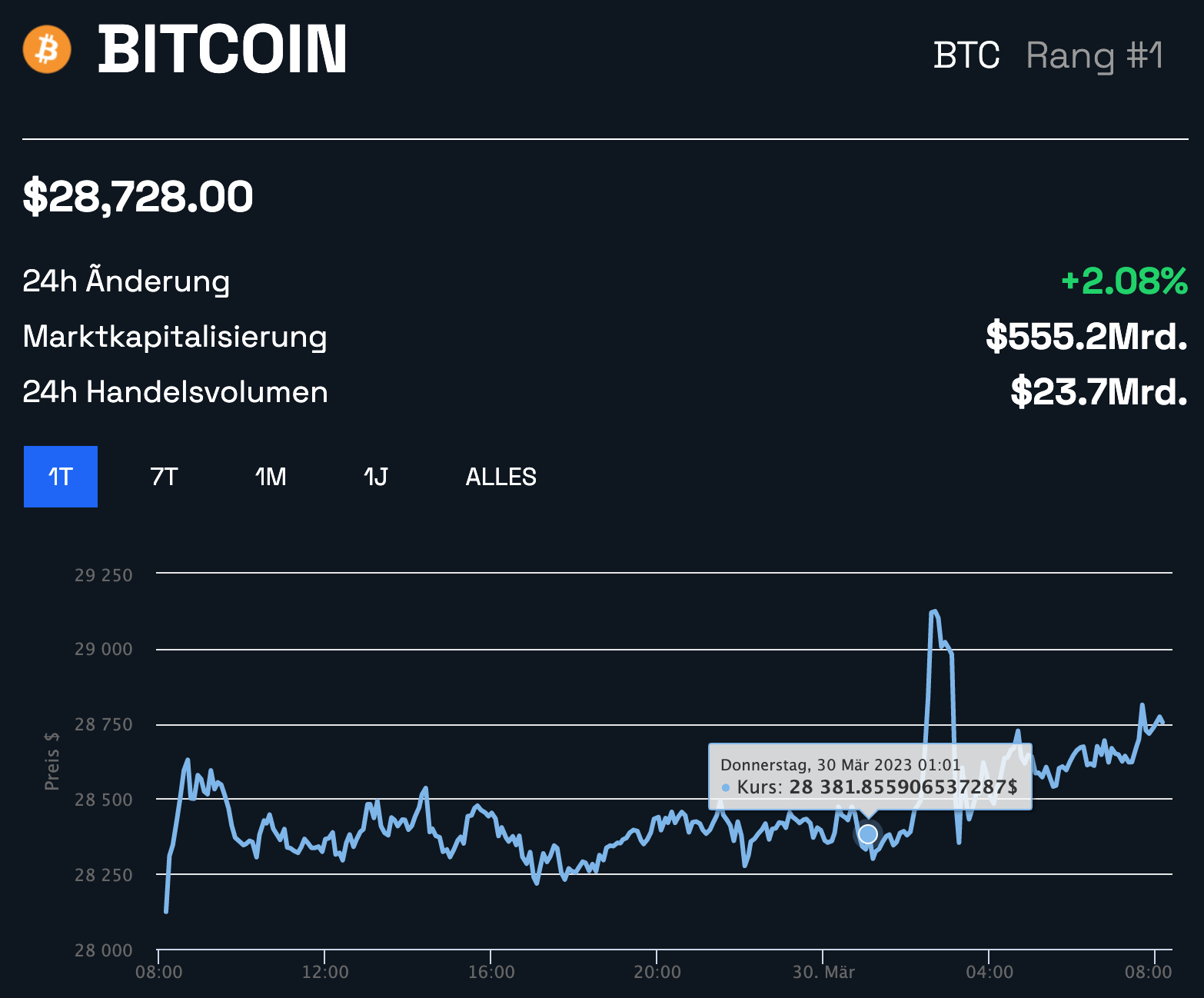 SponsoredAktuell liegt BTC bei etwa 28.600 USD und verzeichnet damit einen Tagesgewinn von 3,7 %.