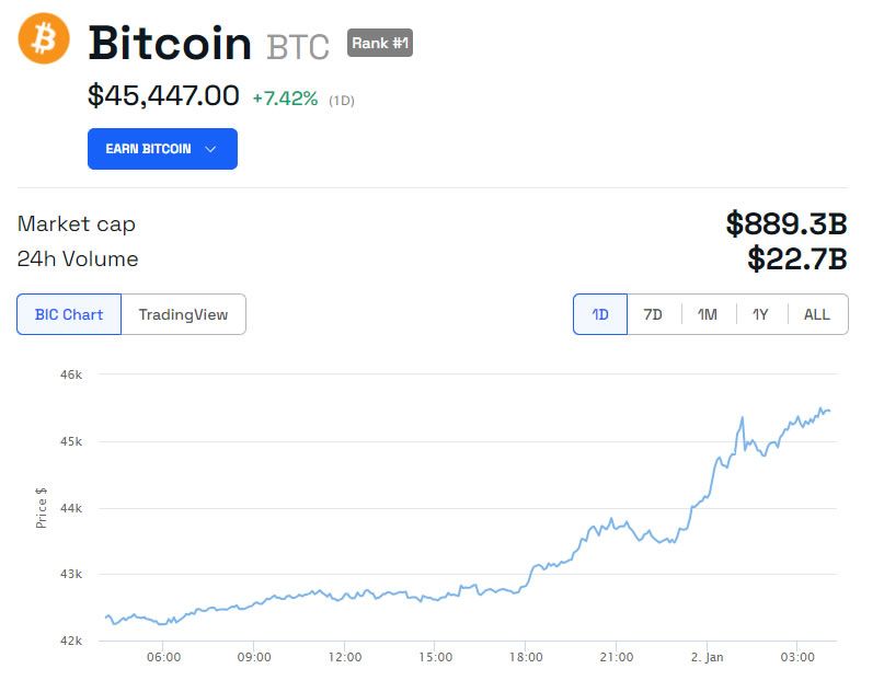 Bitcoin führt diese Zuwächse mit einem Kursanstieg von 7,5 Prozent im Laufe des Tages an und erreicht ein Tageshoch von 45.500 USD. Dies ist der höchste Preis, den der Vermögenswert seit März 2022, zwei Monate vor dem Zusammenbruch von Terra/Luna, erreicht hat.