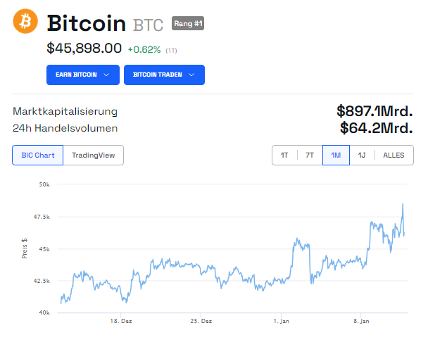 Der Bitcoin Kurs überstieg bei Beginn des ersten ETF-Handels kurzfristig die Marke von 49.000 US-Dollar, korrigierte seitdem jedoch wieder. Nach dem neuen Jahreshoch fiel der BTC Preis dann auf die 46.000 US-Dollar Marke.