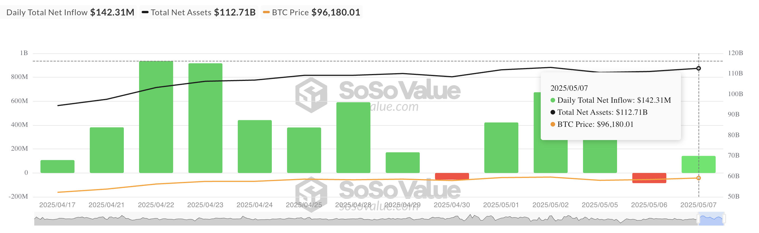 Am Mittwoch änderte sich der Trend jedoch dank der Entscheidung der Fed, die Zinssätze beizubehalten. Die Ankündigung löste einen starken Anstieg des Anlegervertrauens aus und führte zu frischen Zuflüssen von 142,31 Mio. USD in BTC-ETFs.