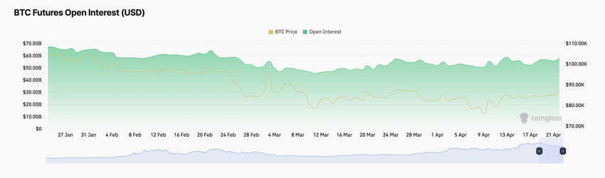 BTC hat in den letzten 24 Stunden einen moderaten Anstieg von 1 Prozent verzeichnet. Dieser Kursanstieg hat zu einem Anstieg der Anzahl neuer offener Kontrakte im Futures-Markt des Coins geführt, was sich in einem steigenden offenen Interesse an Futures widerspiegelt. Zum Zeitpunkt der Veröffentlichung liegt dieses bei 58,46 Mrd. USD, ein Anstieg von 5 Prozent im Vergleich zum Vortag.