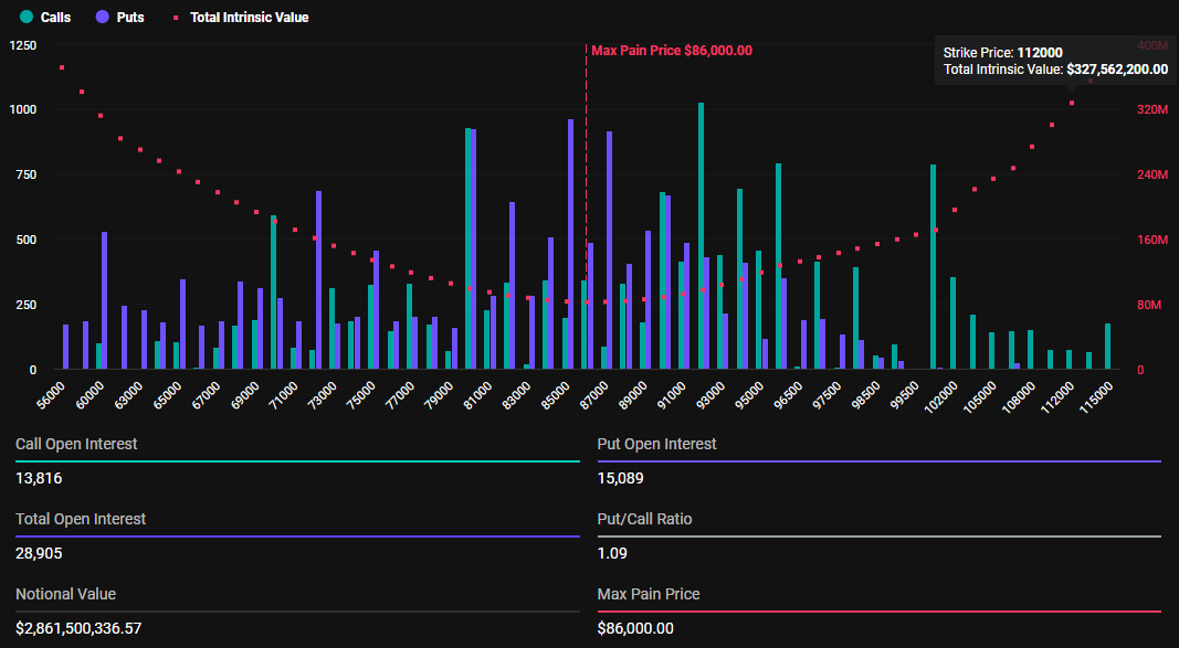 Es gibt einen deutlichen Anstieg bei Bitcoin (BTC) und Ethereum (ETH) Kontrakten, die heute auslaufen, im Vergleich zur letzten Woche. Laut Daten von Deribit werden am Freitag 28.905 Bitcoin-Optionskontrakte fällig, mit einem Put-Call-Verhältnis von 1,09 und einem maximalen Verlustpunkt von 86.000 USD.