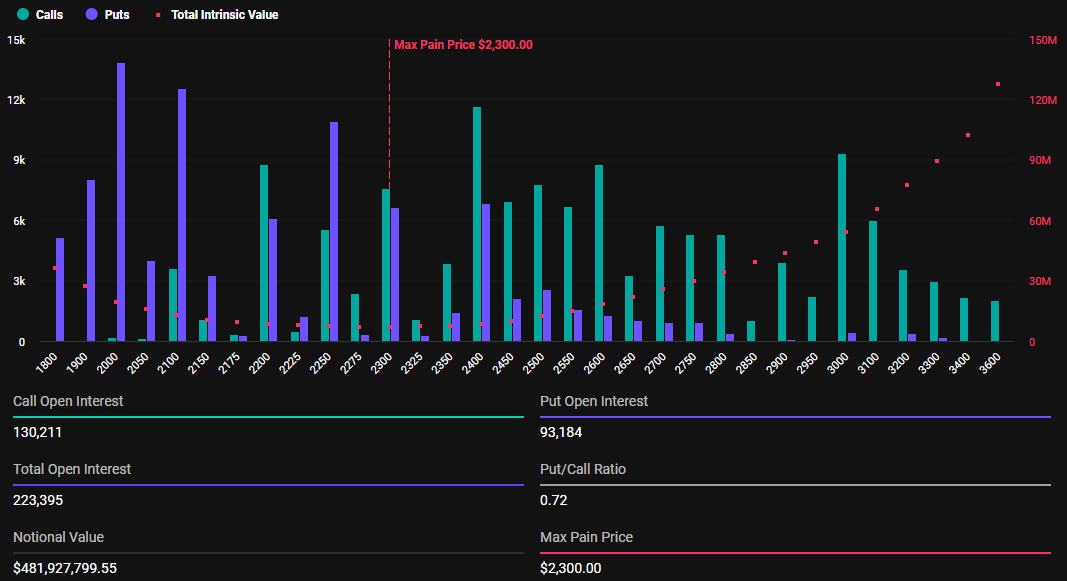 Darüber hinaus sind auf Ethereum 223.395 Kontrakte mit einem Nominalwert von 481,9 Millionen USD ausstehend. Der maximale Verlustpunkt für diese Kontrakte liegt bei 2.300 USD mit einem Put-Call-Verhältnis von 0,72.