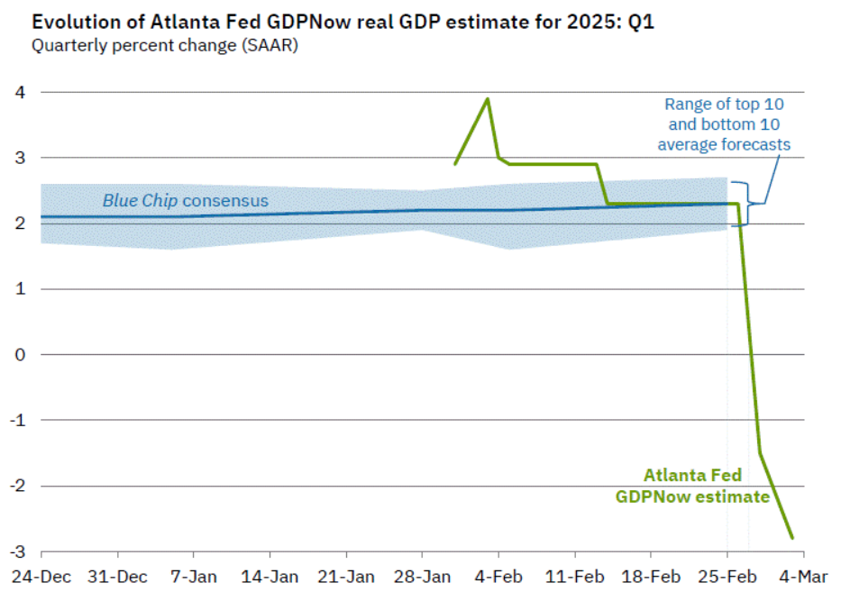 Die Fed prognostiziert nun, dass das US-BIP bis Ende Q1 2025 um 2,8 Prozent schrumpfen wird. Aus wirtschaftlicher Sicht ist dies apokalyptisch verglichen mit ihren Prognosen vor vier Wochen, die ein Wachstum von 3,9 Prozent zeigten.