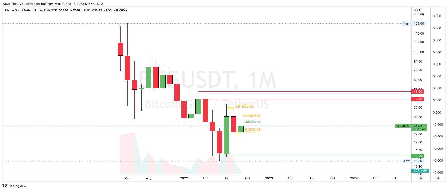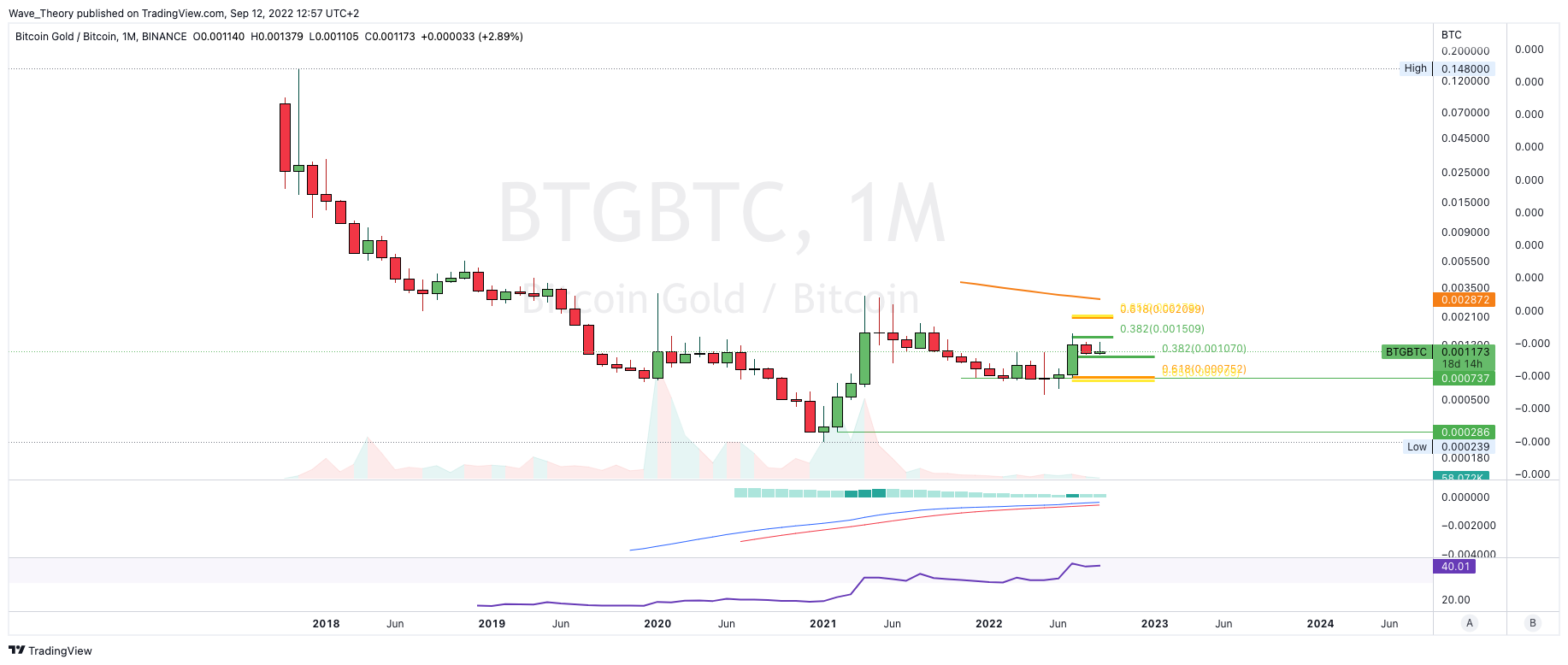 Nach unten hin findet BTG bei rund 0,00107 BTC und 0,00075 BTC signifikante Fib Unterstützungen. Nach oben hin warten bei rund 0,0015 BTC und 0,0021 BTC signifikante Fib Widerstände. Zudem fungiert der 50-Monate-EMA bei 0,002872 BTC als signifikanter Widerstand.