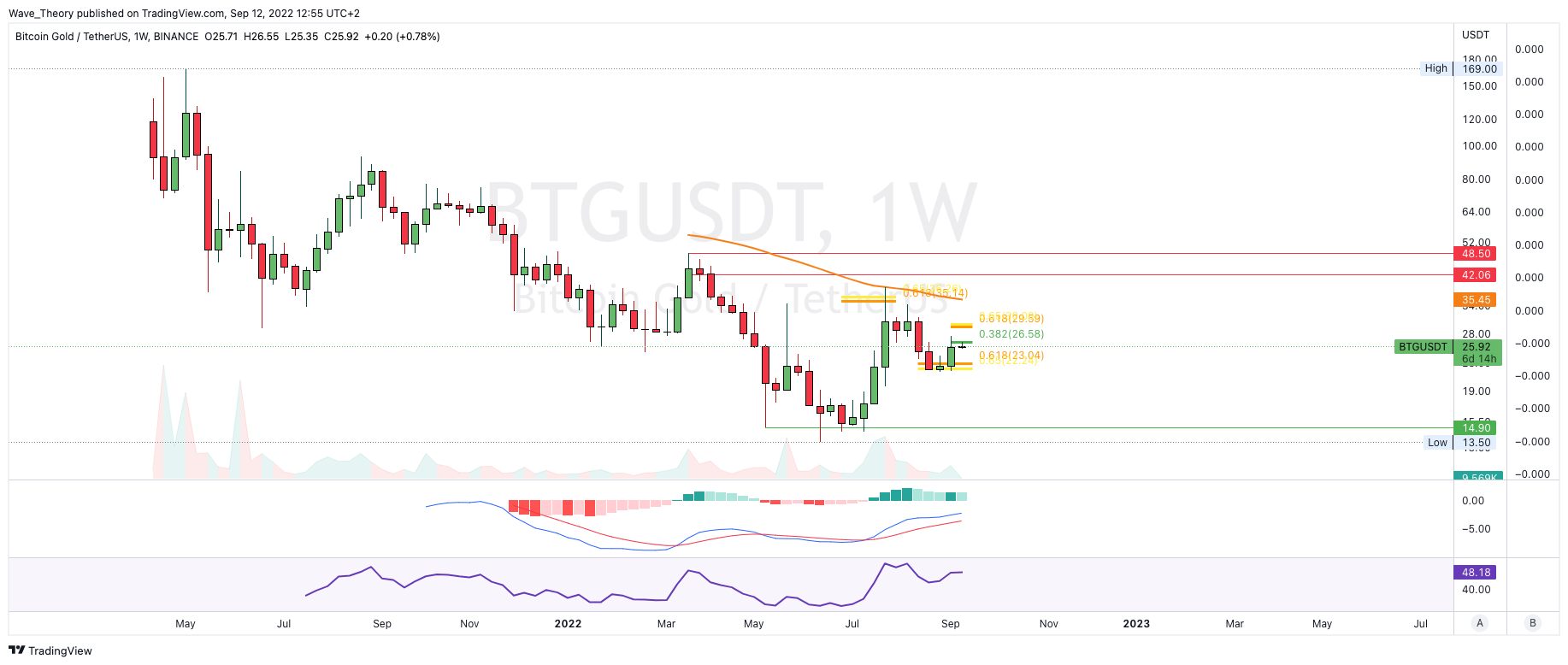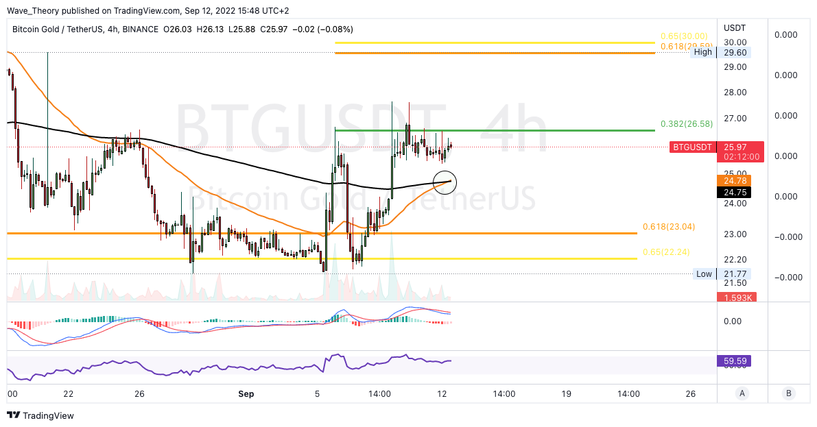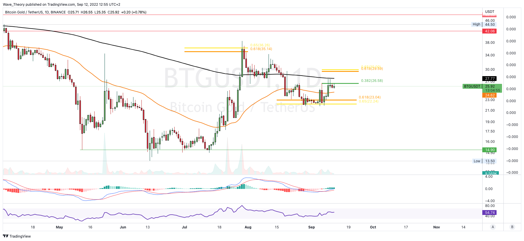 Der September verläuft bisher bullisch für den BTG Kurs. Denn durch das Abprallen an der Golden Ratio Unterstützung bei rund 23 USD könnte der BTG Kurs den Fibonacci Widerstand bei rund 36 USD anvisieren, woran Bitcoin Gold zuvor bärisch abgewiesen wurde.