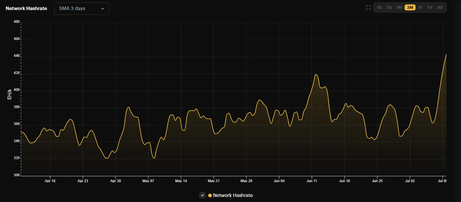 BitInfoCharts bestätigte am 8. Juli ebenfalls ein neues Rekordhoch von 465 EH/s und am folgenden Tag einen Wert von 428 EH/s.