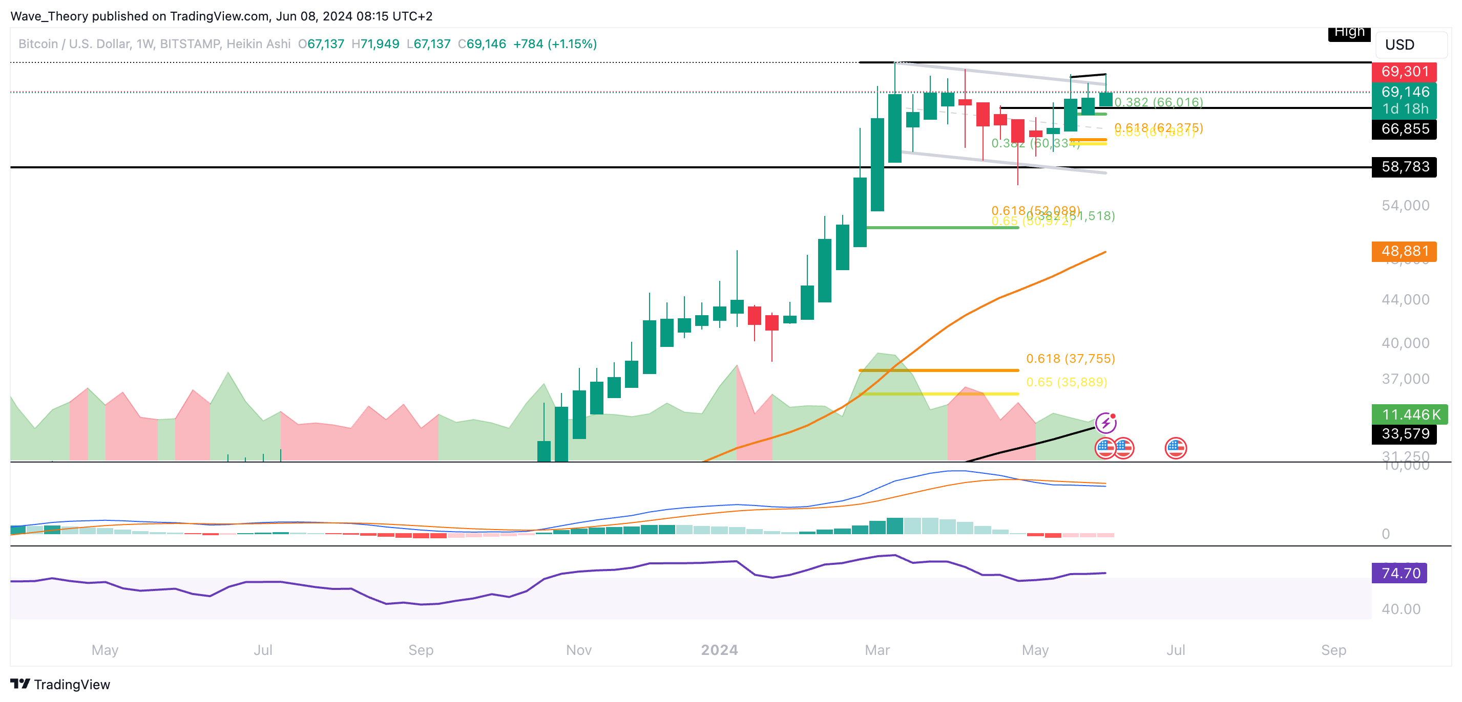 Insgesamt befindet sich Bitcoin aber seit Ende 2022 in einem massiven Aufwärtstrend. So sind auch die MACD Linien bullisch überkreuzt, wohingegen sich der RSI in überkauften Regionen befindet.