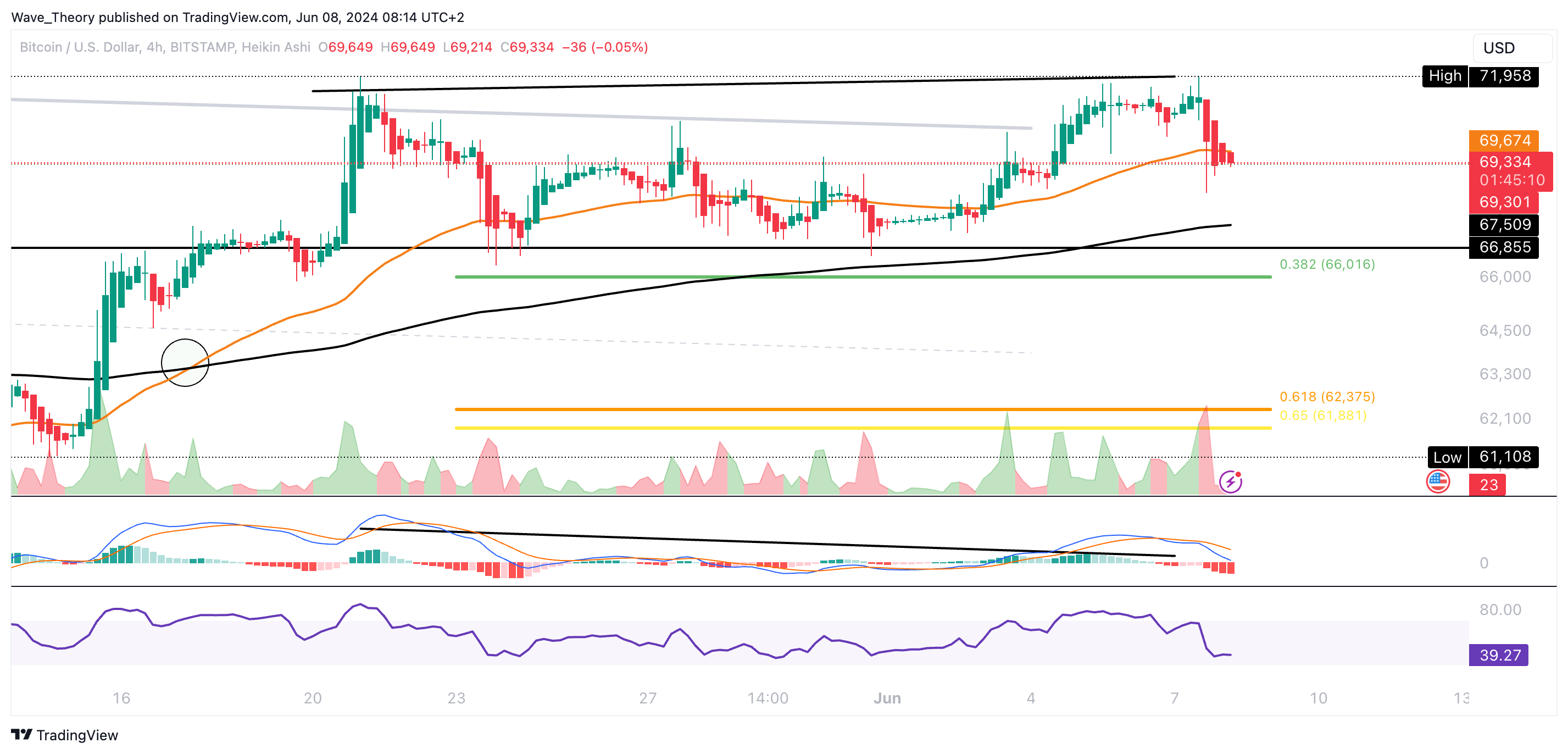 Auch im 4H-Chart sieht es für den BTC Kurs nach einer Korrekturbewegung aus. So bestätigt das Golden Crossover EMAs zwar auch hier den Trend kurzfristig bullisch, jedoch haben sich die MACD Linien bärisch überkreuzt und das Histogramm des MACDs tickt bärisch tiefer.