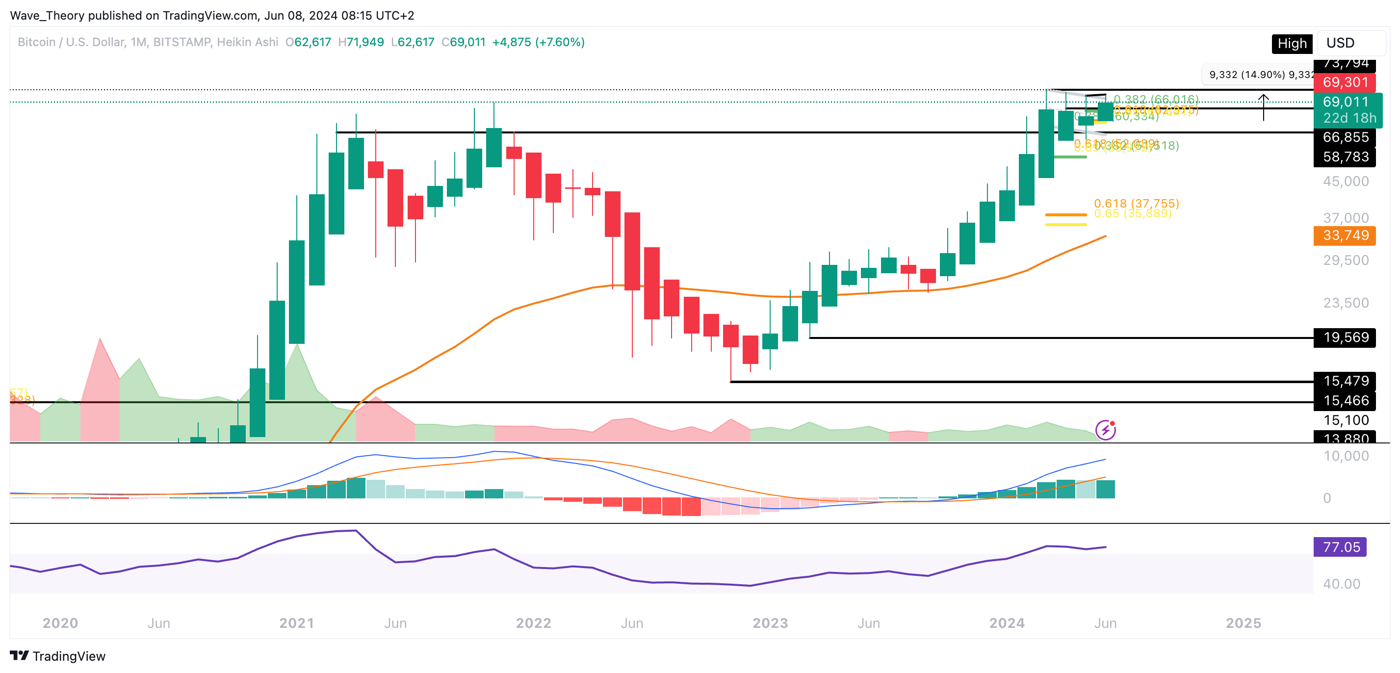 Bitcoin findet dann zwischen rund 66.000 USD und 66.855 USD signifikante Unterstützung. Dort liegt das 0,382 Fib Niveau und der 50-Tage-EMA, welcher als zusätzliche Unterstützung dient.