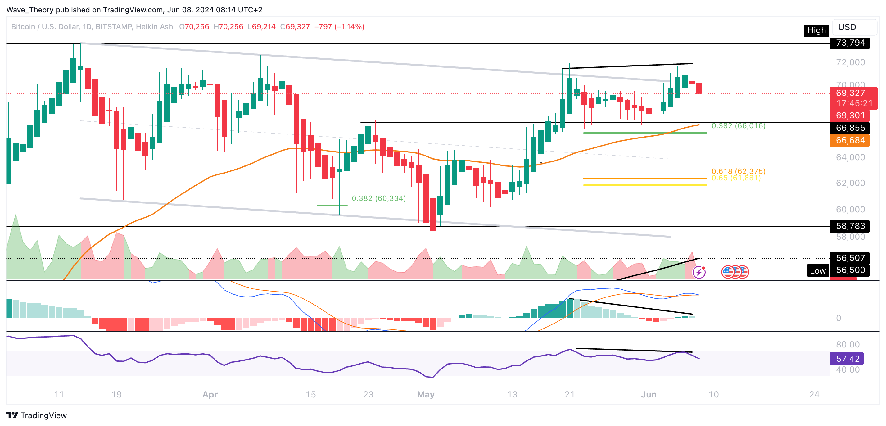 Bitcoin hat bei rund 71.960 einen höheren Hochpunkt geformt. Währenddessen zeichnet das Histogramm des MACDs und der RSI im Tageschart eine bärische Divergenz ab.