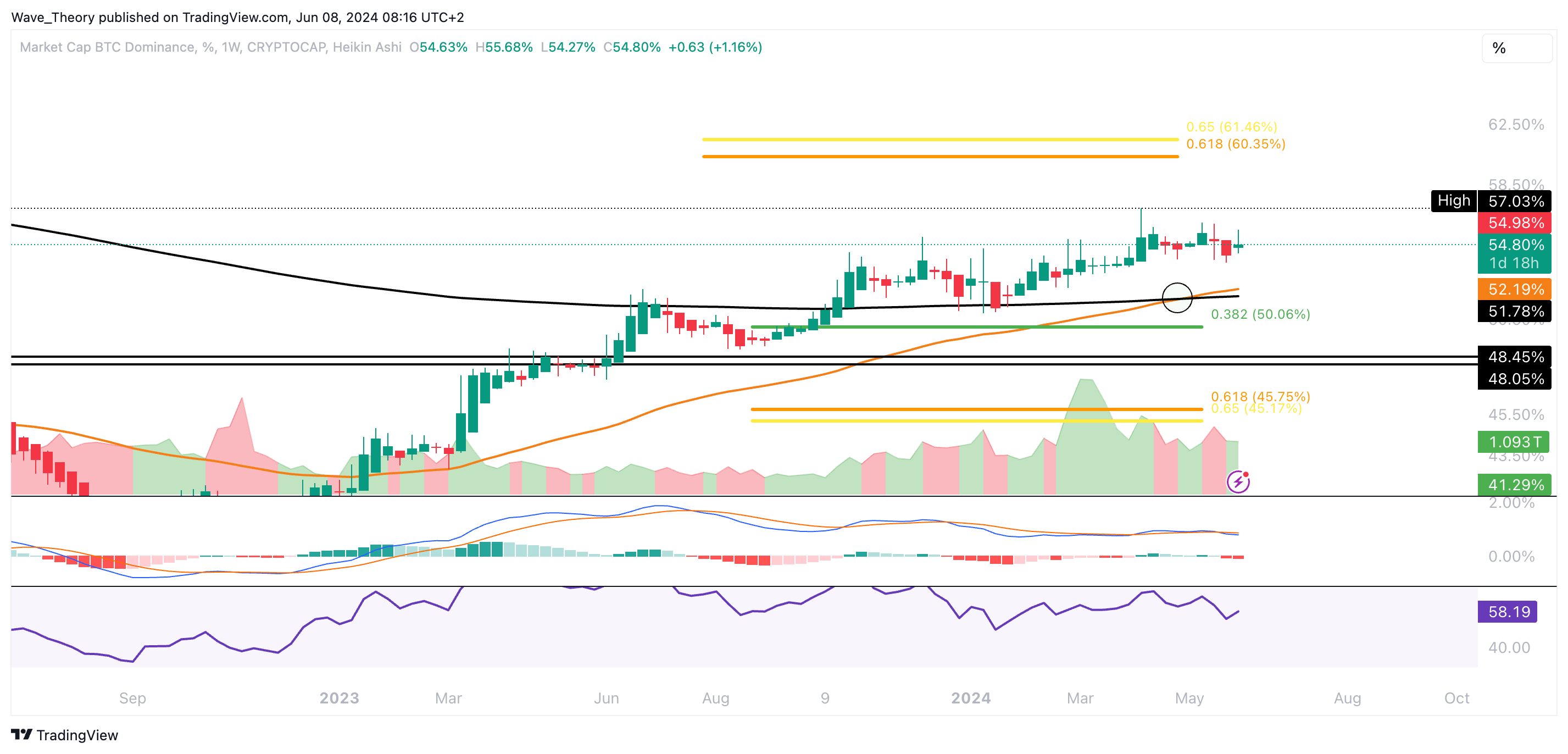 Sollte die Bitcoin Dominanz weiter fallen, wartet bei rund 52,6 % die nächste signifikante Unterstützung am 50-Monate-EMA. Darüber hinaus warten bei rund 50 % und 45 % die nächsten signifikanten Fib Unterstützungen.
