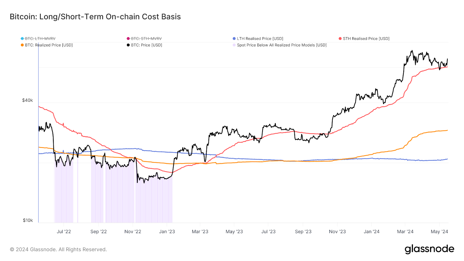 - Short-Term Holder Realized Price: Der durchschnittliche Preis, den Investoren für BTC bezahlt haben, die sie in den letzten 155 Tagen bewegt haben. Diese BTC sind am ehesten dazu bestimmt, bald ausgegeben oder verkauft zu werden.