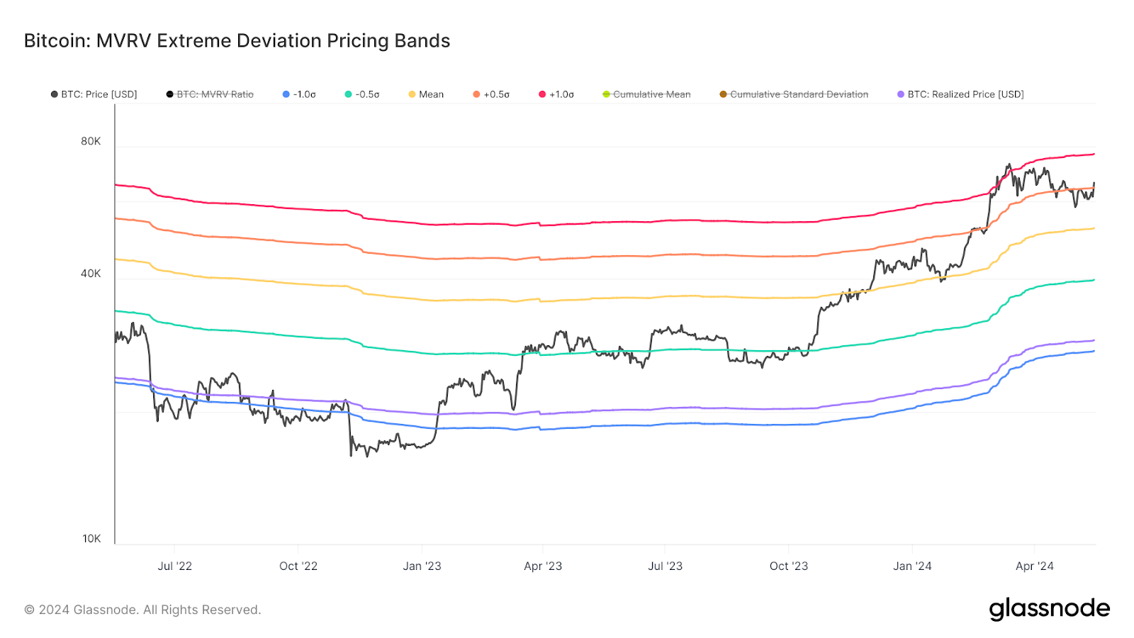 - Pricing Bands: Diese Bänder zeigen die oberen und unteren Grenzen des Bitcoin Preises basierend auf seinen historischen MVRV-Werten, um zu helfen zu identifizieren, wann BTC entweder extrem überbewertet oder unterbewertet ist, basierend auf historischen Preisdaten.