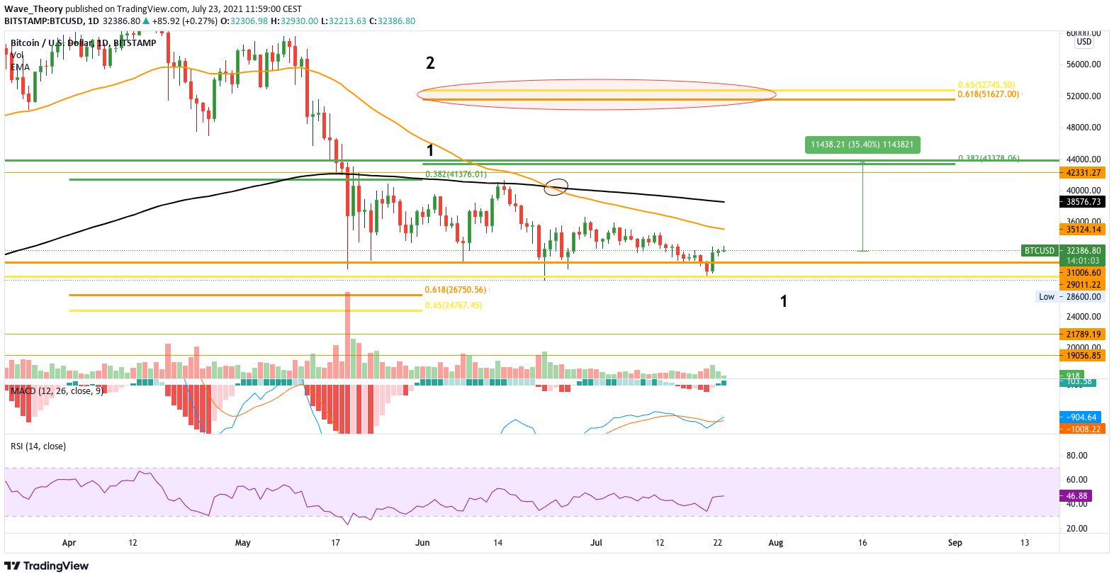Der Bitcoin Preis stieg nicht unter die wichtige Fibonacci Unterstützung an der Golden Ratio bei 30.000 USD. Während dies ein sehr positives Zeichen ist, bleiben die EMAs noch immer bärisch überkreuzt. Hinsichtlich des starken Bounces an der Golden Ratio bei 30.000 USD und der bullischen Überkreuzung des MACDs, könnte hier mit einem Anstieg bis zum nächsten Widerstand bei 43.000 USD gerechnet werden. Das entspricht einem Anstieg von rund 36 % vom aktuellen Preisniveau.