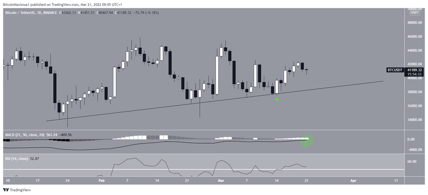 Auf dem Tageschart kannst du sehen, dass der Bitcoin Kurs seit dem 22. Januar 2022 über einer aufsteigenden Support-Linie gehandelt wird. Am 14. März 2022 ist der BTC Kurs von dieser Linie abgeprallt, wobei die entsprechende Tageskerze die Gestalt einer bullischen Engulfing-Candlestick hat.