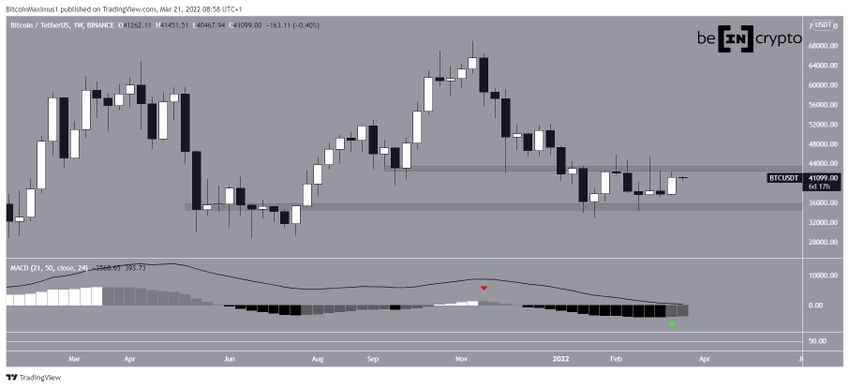 Der Bitcoin Kurs ist in der letzten Woche (13-20. März) kontinuierlich angestiegen. Der Wochenschlusskurs lag deutlich über dem Eröffnungskurs und über den Dochten der vorangegangenen Wochenkerzen. Aktuell befindet sich der Bitcoin Preis nur etwas unter dem Widerstandsbereich bei 43.000 USD, der in diesem Jahr noch nicht erfolgreich durchbrochen wurde.