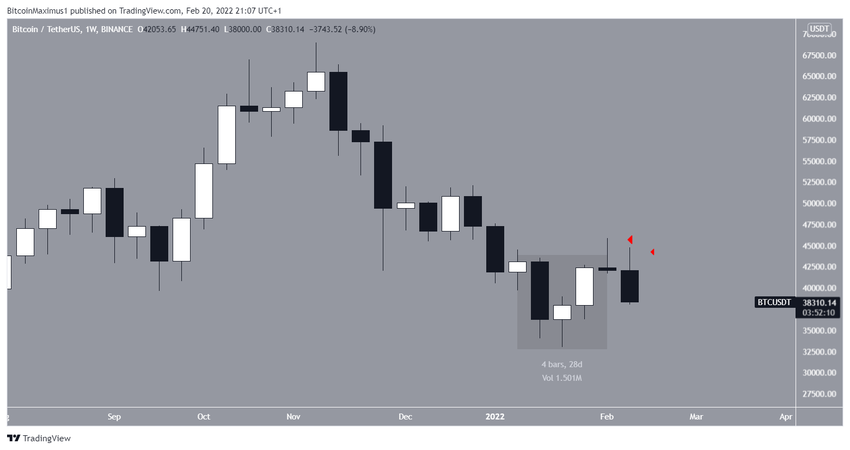 Der Bitcoin Kurs konnte in der letzten Januarwoche (24-31. Januar 2022) eine starke Aufwärtsbewegung hinlegen. Allerdings kehrte sich der Trend in der darauffolgenden Woche um. Auf dem Wochenchart kannst du sehen, dass die letzte und aktuelle Wochenkerze zwei lange, obere Wicks besitzen. Das ist ein Zeichen für starken Verkaufsdruck.