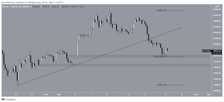 Lass uns einen Blick auf den 6-Stunden-Chart werfen, um kurzfristige Support-Level zu identifizieren. Der Bitcoin Kurs könnte bei dem 0.618-Fib-Retracement-Level bei 37.860 USD abprallen. Außerdem befindet sich dort ein horizontaler Support-Bereich. Das 0.618-Fib-Retracement-Level ist typischerweise eine Schranke für den Trend. Damit der Bitcoin Preis kurzfristig ansteigen kann, muss dieses Level halten. Der nächste horizontale Unterstützungsbereich befindet sich bei 36.200 USD.