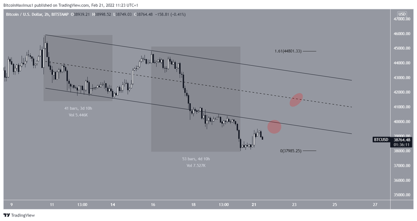 Auf dem 2-Stunden-Chart kannst du sehen, dass sie Abwärtsbewegungen bis jetzt ein 1:1.61-Verhältnis (der Goldene Schnitt) aufweisen. Darum kann es gut sein, dass wir kurzfristig eine Trendumkehr sehen könnten. Falls das passieren sollte, dann wird der BTC Kurs bei 39.600 USD und 40.600 USD auf Widerstand stoßen.